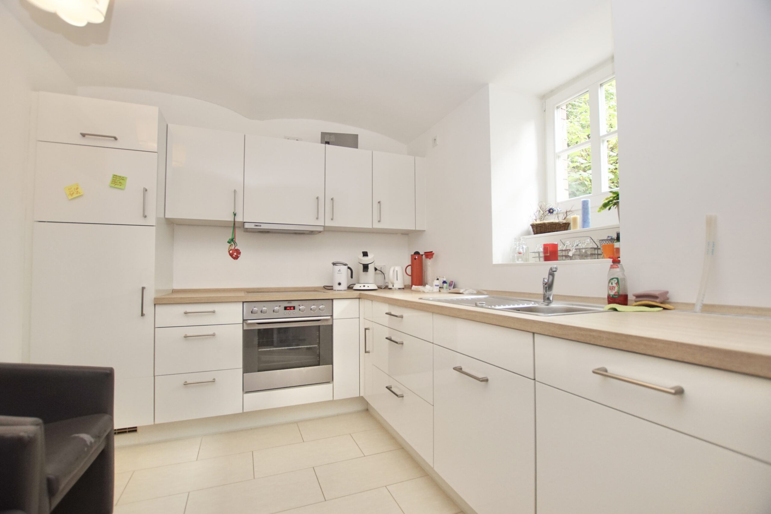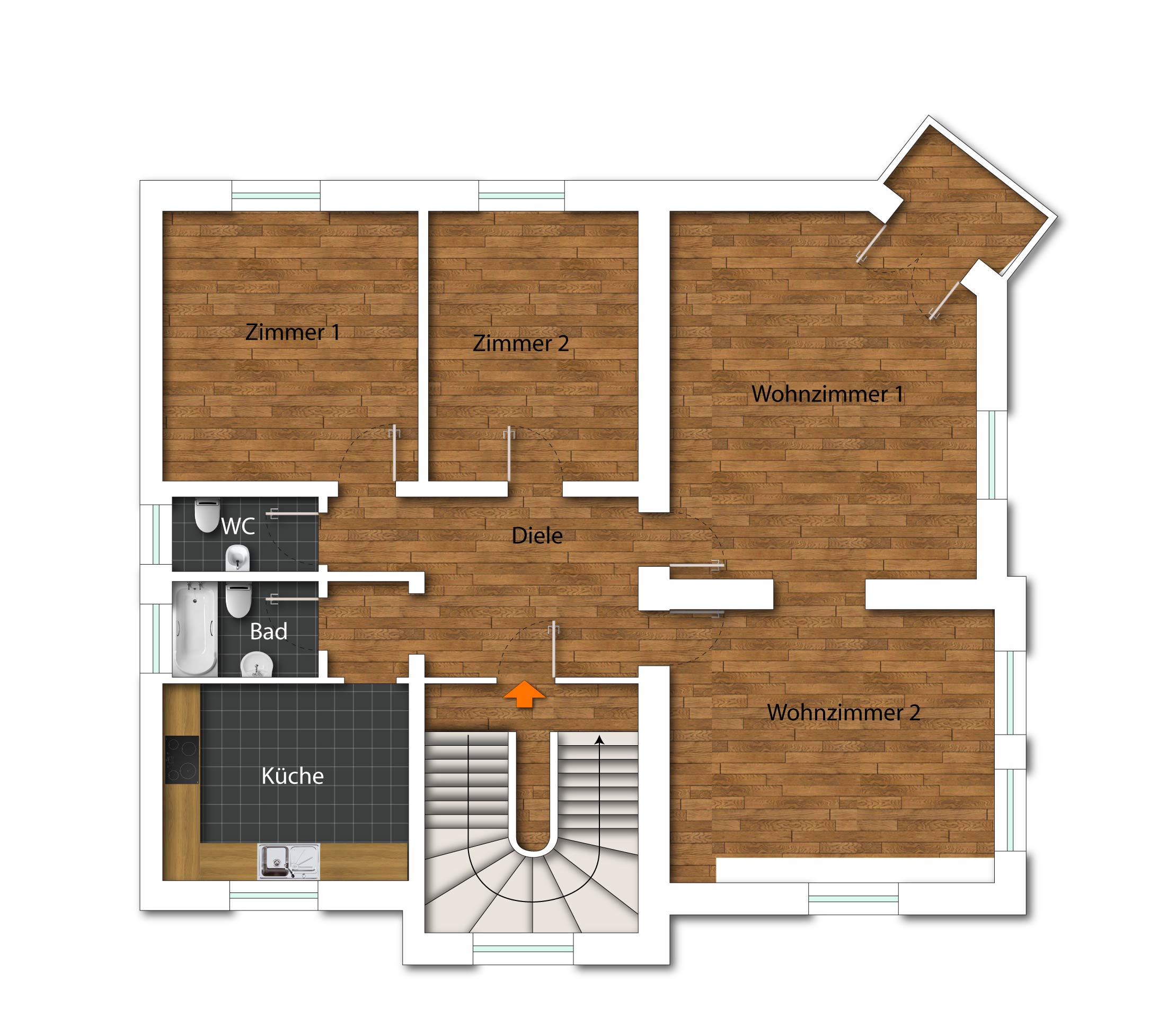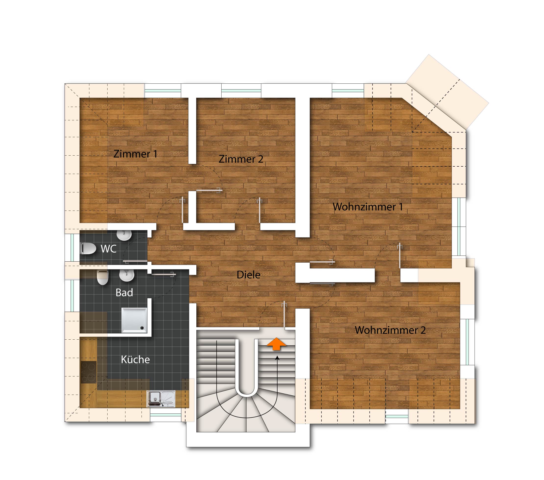 Die Vierzimmerwohnung im 1. Obergeschoss ist ideal für Paare oder Familien mit einem Kind. Besonders schön ist der diagonal gesetzte Erker mit bunten Original-Bleiverglasungen, die man öffnen kann.