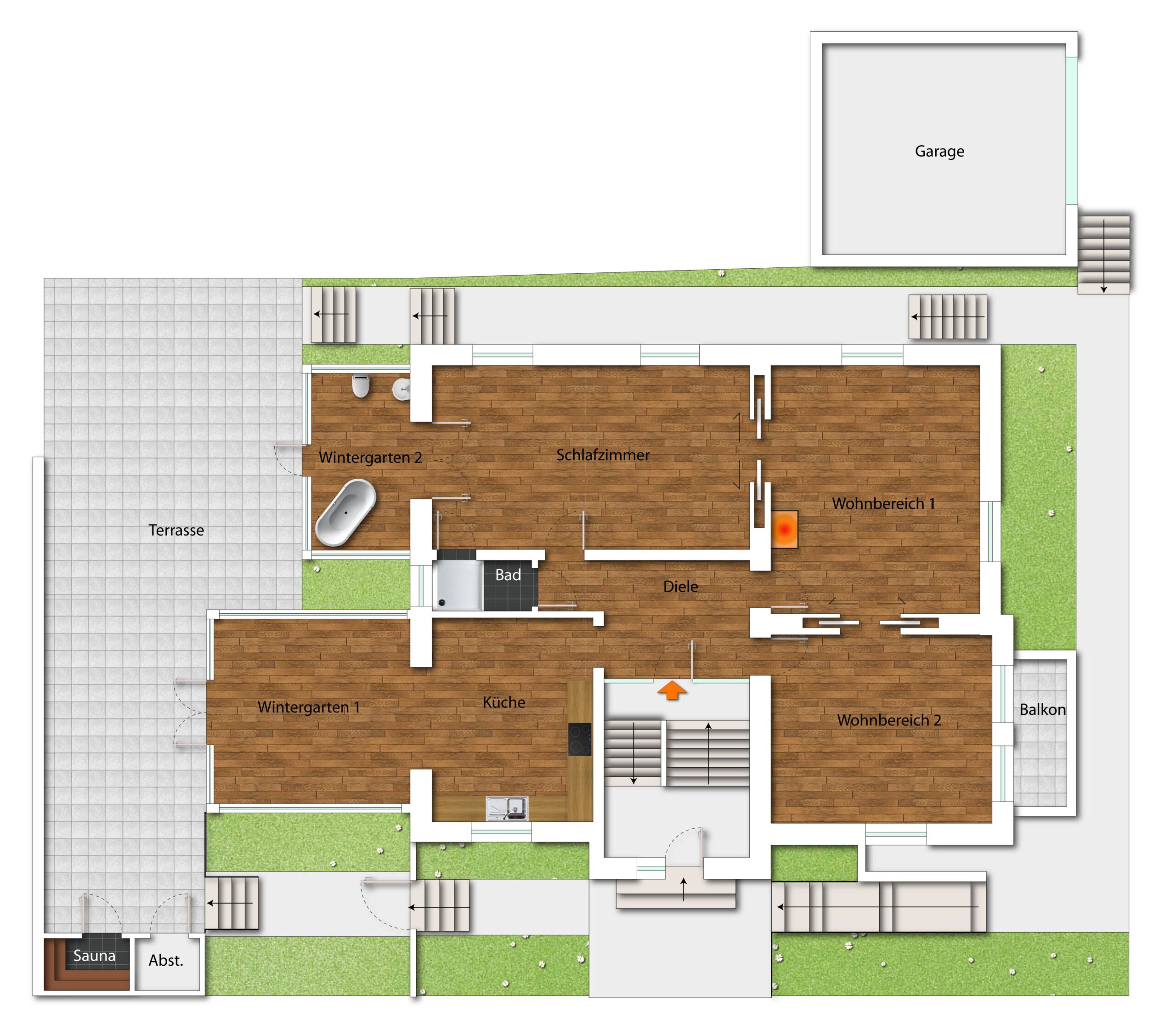 Die größte Wohnung im Hochparterre überzeugt durch die hellen, großen Räume, den massiven Eichenboden, Holztüren und den besonderen Schnitt. An die offene Einbauküche schließt sich der Wintergarten im britischen Stil an und dient als Esszimmer mit freiem Blick in den Garten. Einmalig schön ist das Badezimmer in dem zweiten Wintergarten mit freistehender Badewanne und Ausblick. Zu dieser Wohnung gehört ein Südbalkon, die Gartennutzung sowie die Außensauna. Die Möglichkeit einen Holzofen anzuschließen ist gegeben.