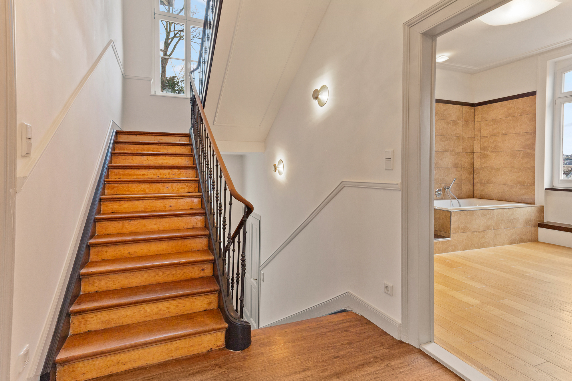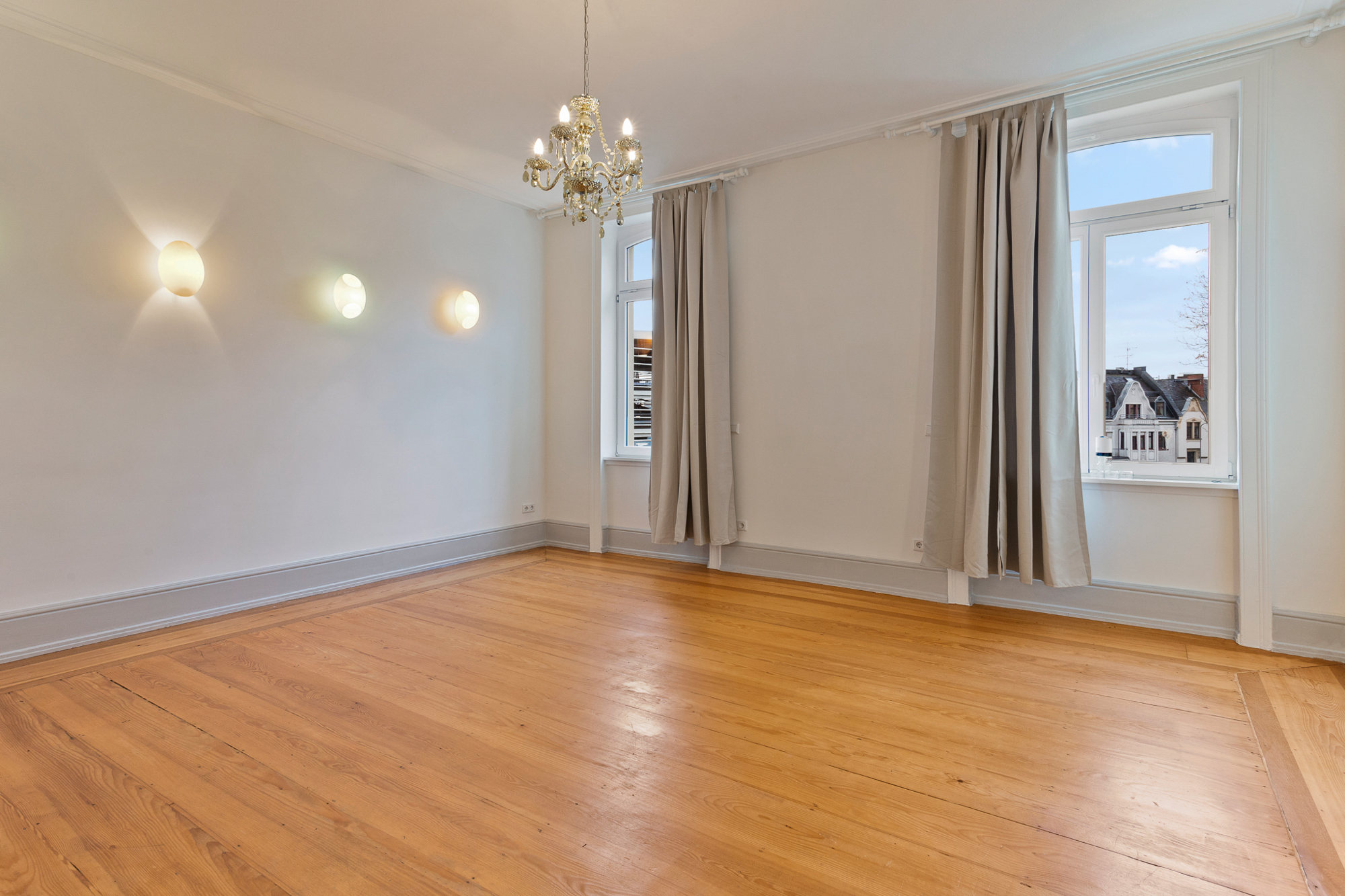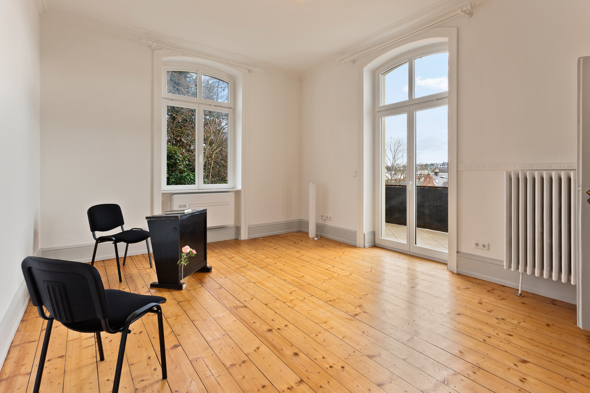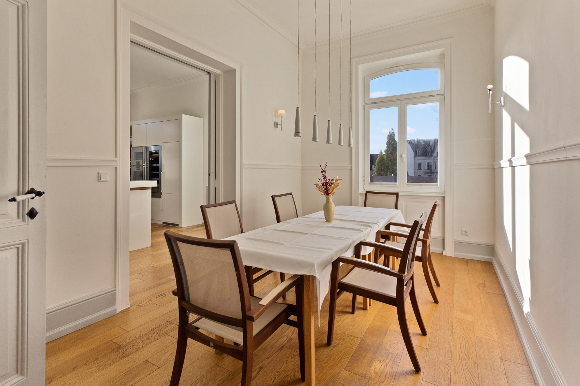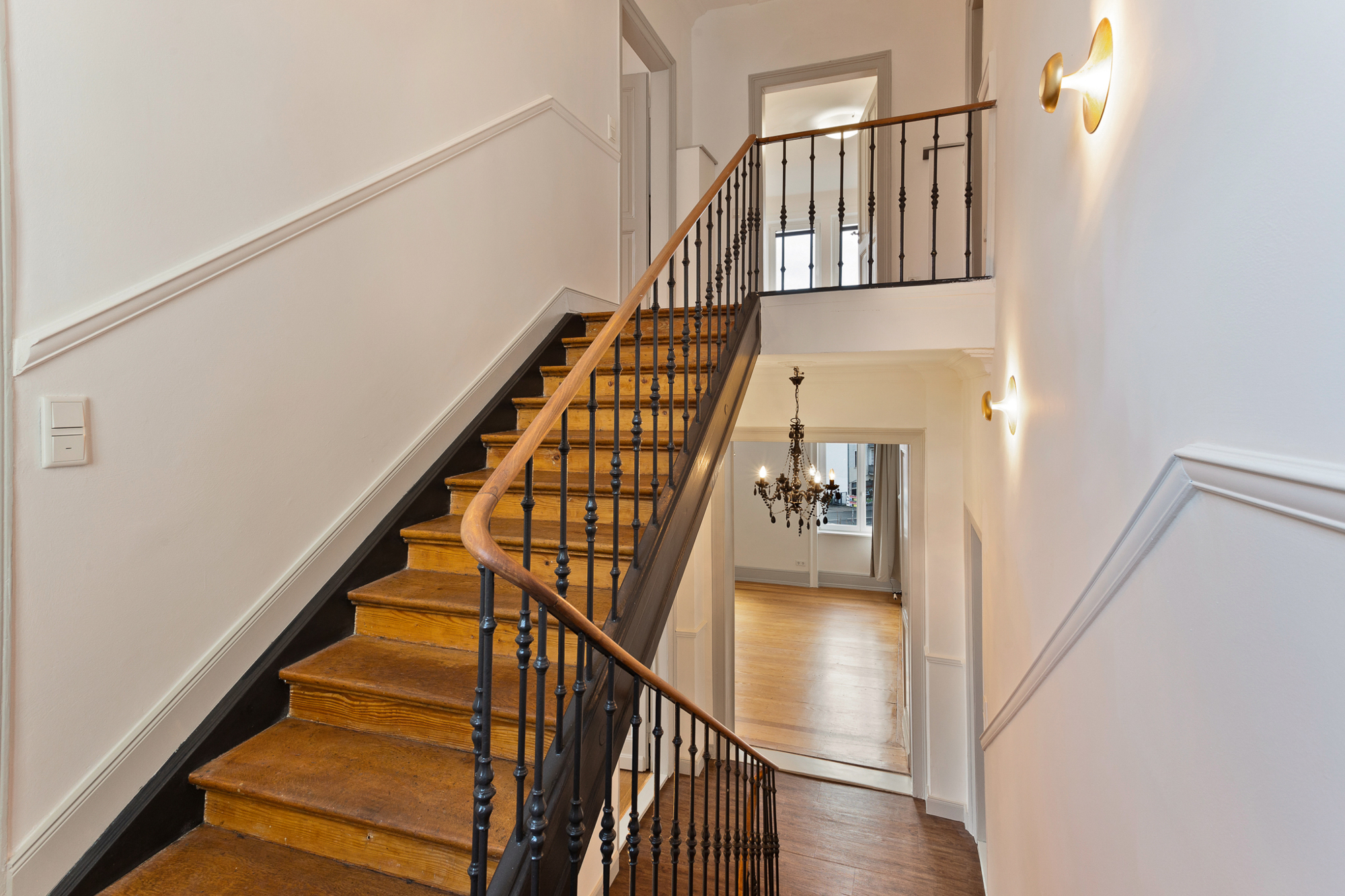 Das historische Ambiente des Hauses wird durch liebevoll restaurierte Details und hochwertige Materialien unterstrichen. Große Fensterflächen lassen viel Tageslicht in die Räume strömen und schaffen eine angenehme Atmosphäre.