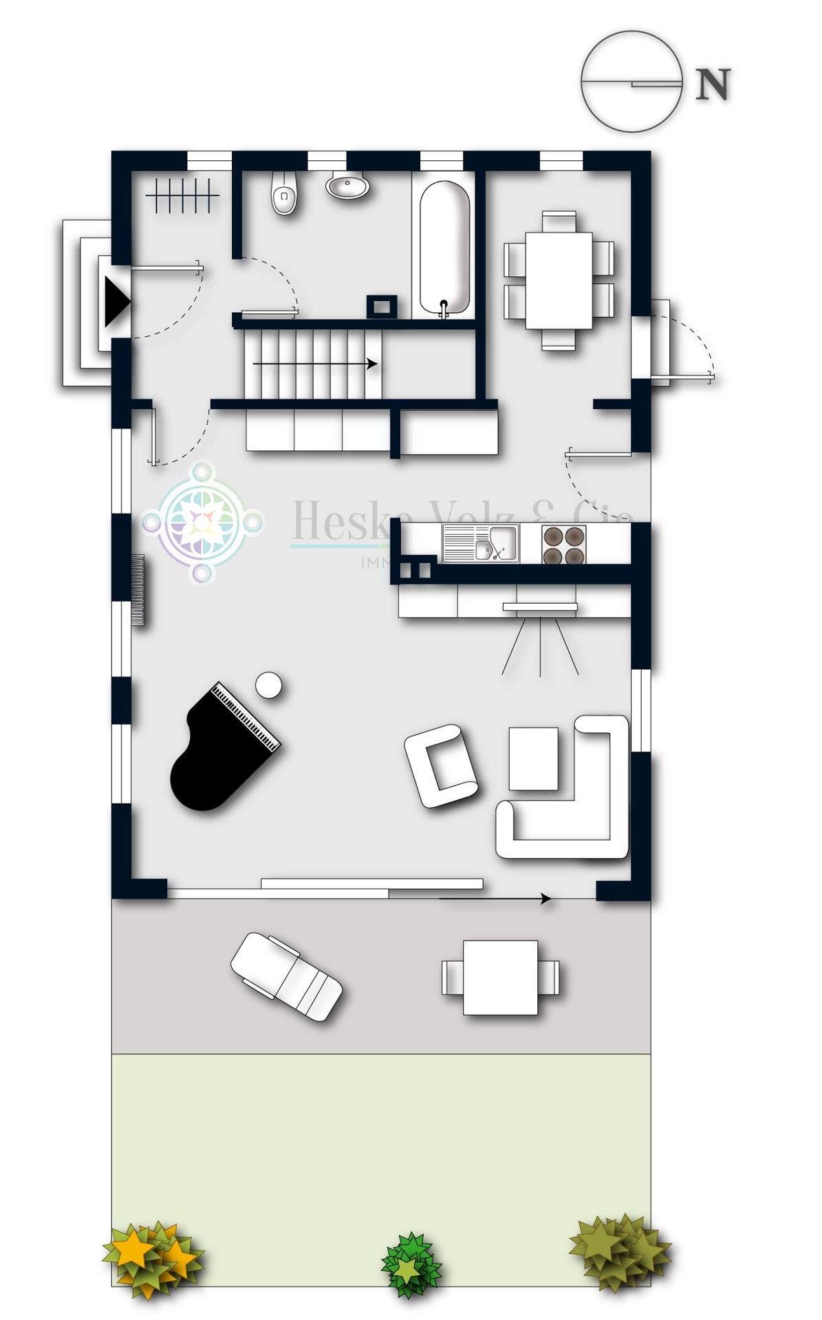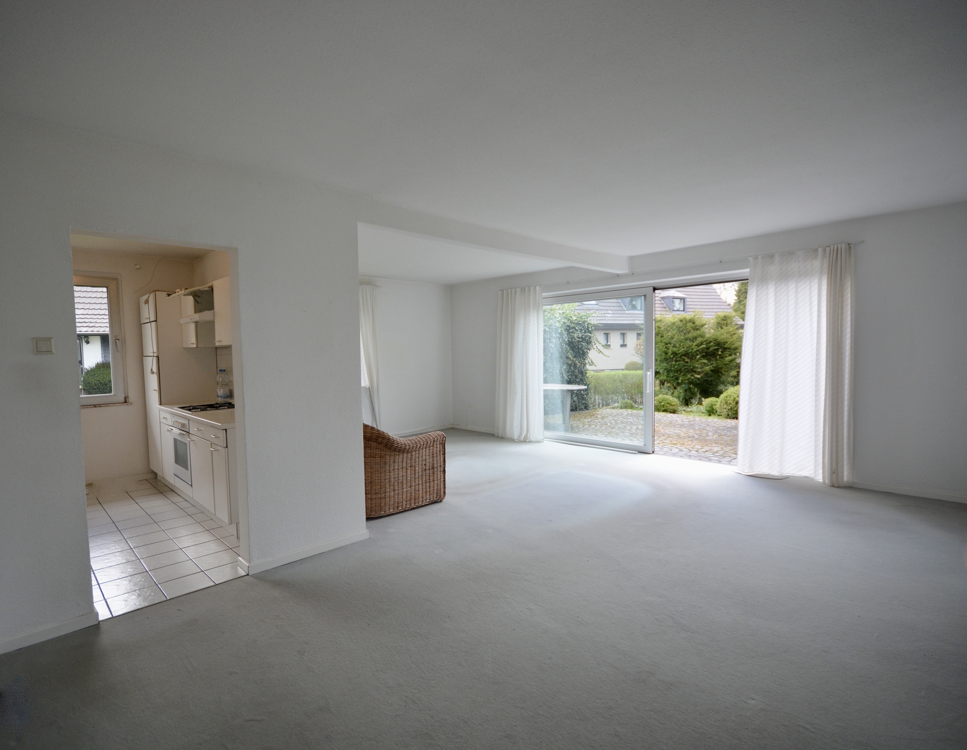 Im Erdgeschoss befindet sich ein großzügiges Badezimmer mit Badewanne, Waschbecken und WC. Das helle Wohnzimmer öffnet sich über eine breite Schiebetür zur sonnigen Terrasse – ein perfekter Ort zum Entspannen. Die angrenzende Einbauküche mit Essecke lädt zum Verweilen ein.