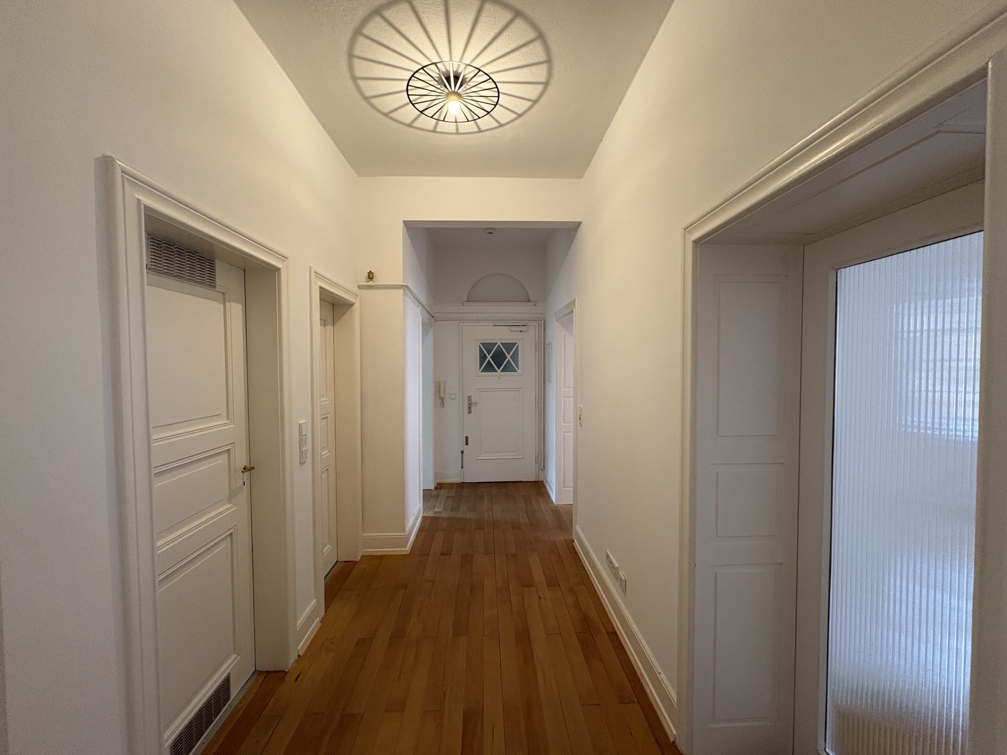 Sie erreichen die Eigentumswohnung über das repräsentative Entrée mit Wänden aus Muschelkalk und expressionistischen Motiven, dem sich ein eleganter Treppenaufgang anschließt.