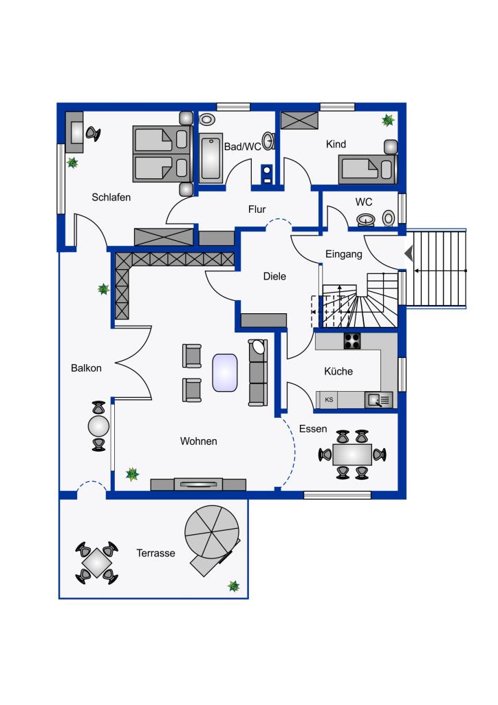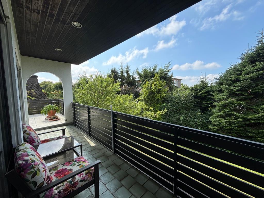 Vom 46 m² Wohn- und Essbereich schauen Sie aus großen Fenstern ins Grüne. Der Balkon liegt nach Süden. von hier kommen Sie direkt auf die große Hochterrasse über der Garage: genießen Sie den Sommer!