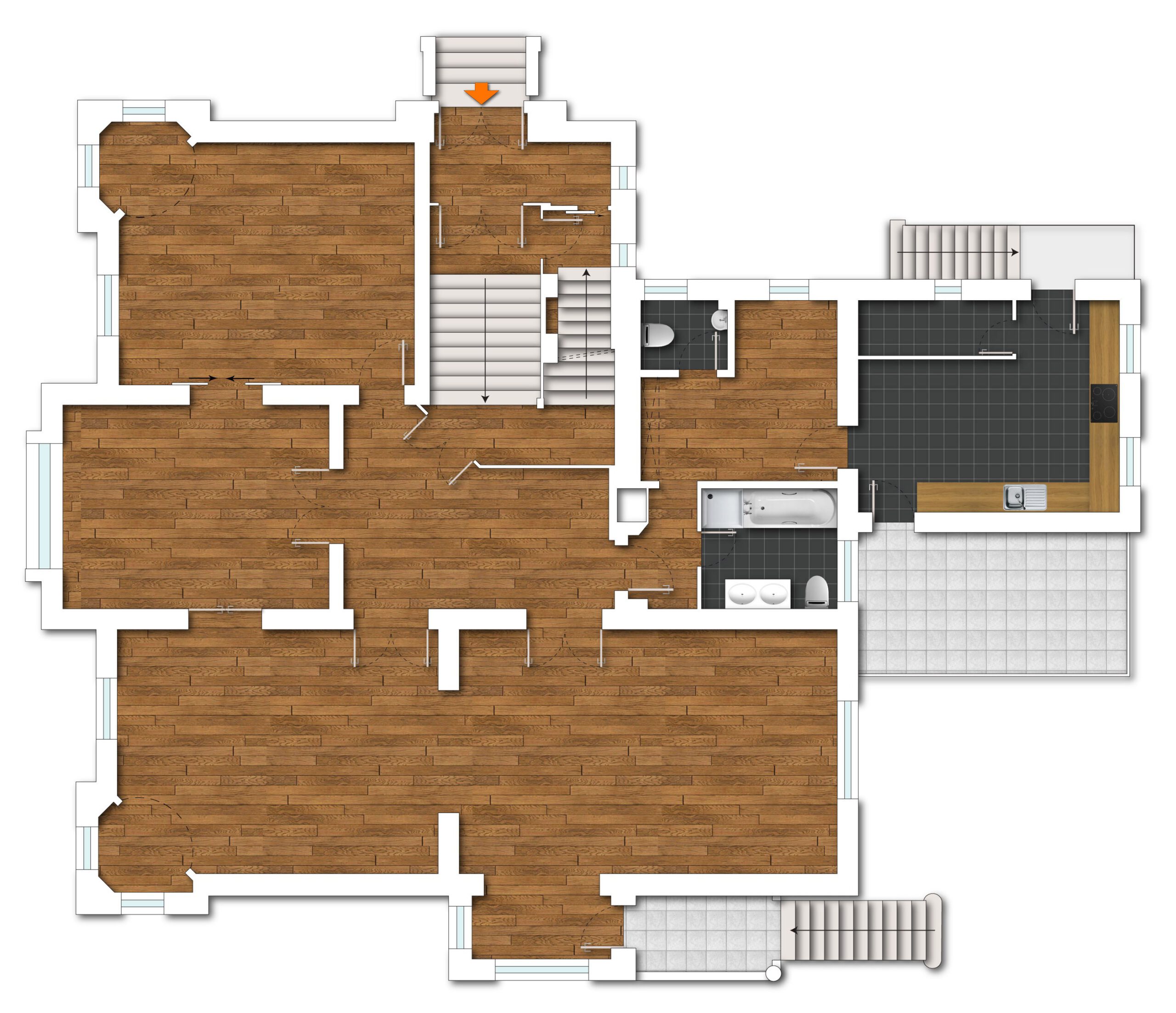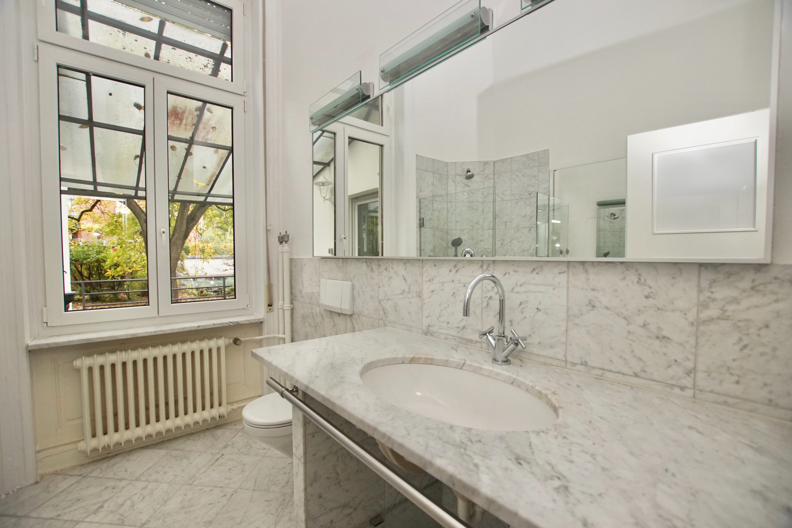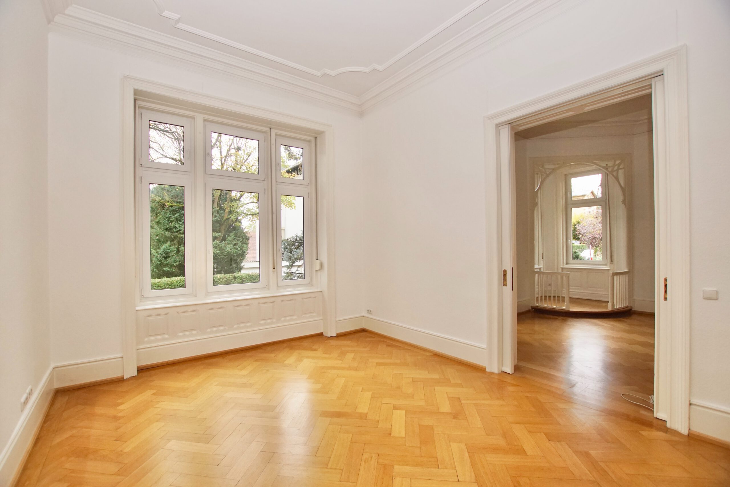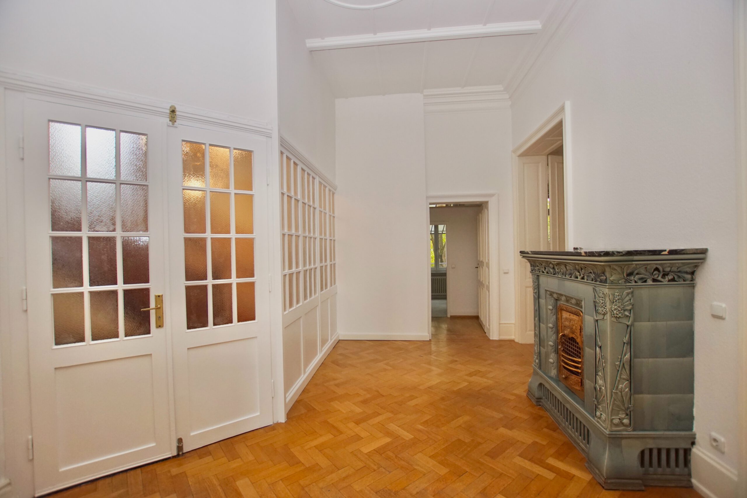 Particularly impressive is the spacious living and dining area with wooden paneling and a small wooden gallery – elegant and luxurious. Behind the magnificent original Art Nouveau fireplaces, the radiators are discreetly hidden.
