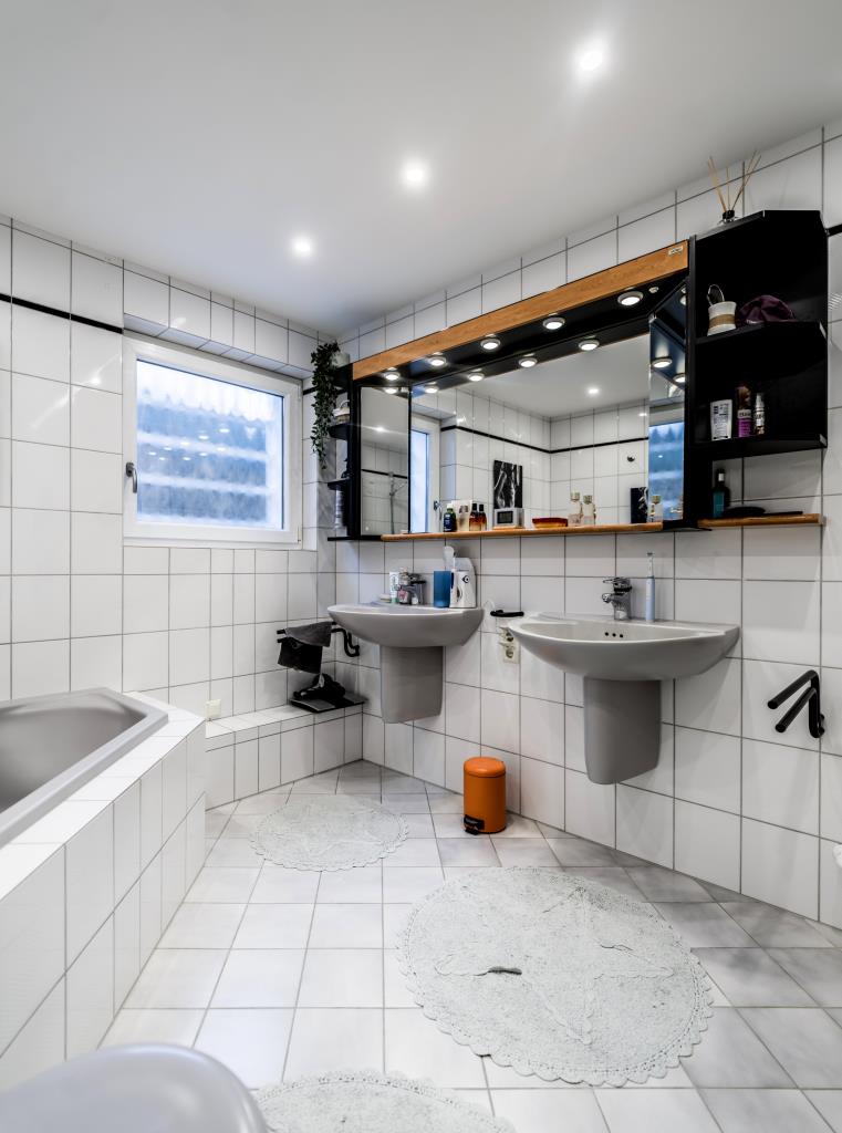 Die Technik des Hauses ist ebenso durchdacht: Die Heizzentrale für Heizung und Warmwasser befindet sich in einem separaten Raum unter der Garage. Ein moderner Gas-Brennwertkessel mit Walltherm-wasserführendem Holzvergaserbrenner wird durch Solarthermie sowie eine Photovoltaikanlage zur Eigenstromerzeugung unterstützt. -