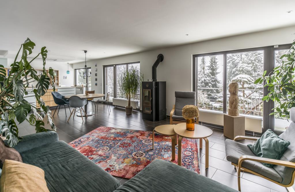Für behagliche Wärme sorgt ein sehr effizienter, wasserführender Kaminofen, der nicht nur den Wohnbereich, sondern das gesamte Haus beheizen kann.