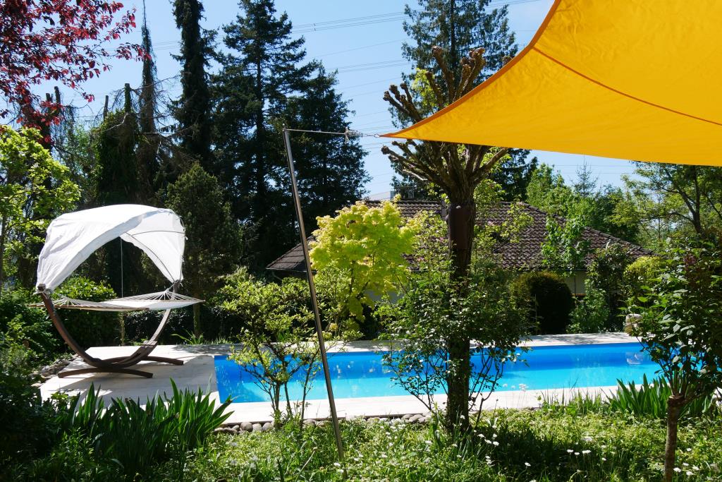 Das sonnige Gartengeschoss überzeugt mit direktem Blick auf den großen Outdoor-Pool. Hier stehen Ihnen zwei weitere Schlafzimmer, ein großzügiges Badezimmer mit Badewanne und Dusche, ein Hobbyraum sowie ein Hauswirtschaftsraum zur Verfügung. Ergänzt wird diese Ebene durch einen praktischen Vorratskeller.