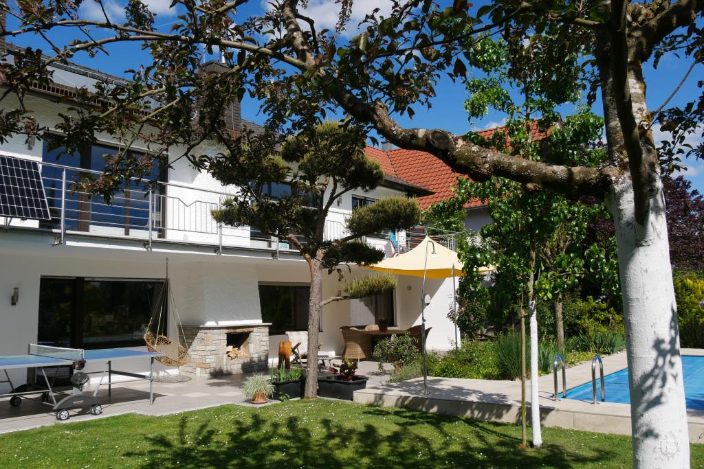 Auf zwei Etagen erwarten Sie großzügige, lichtdurchflutete Räume sowie ein Balkon und eine Terrasse über die gesamte Hausbreite. Von hier genießen Sie den freien Blick in den liebevoll angelegten Ziergarten mit großem Pool – ein echtes Highlight.