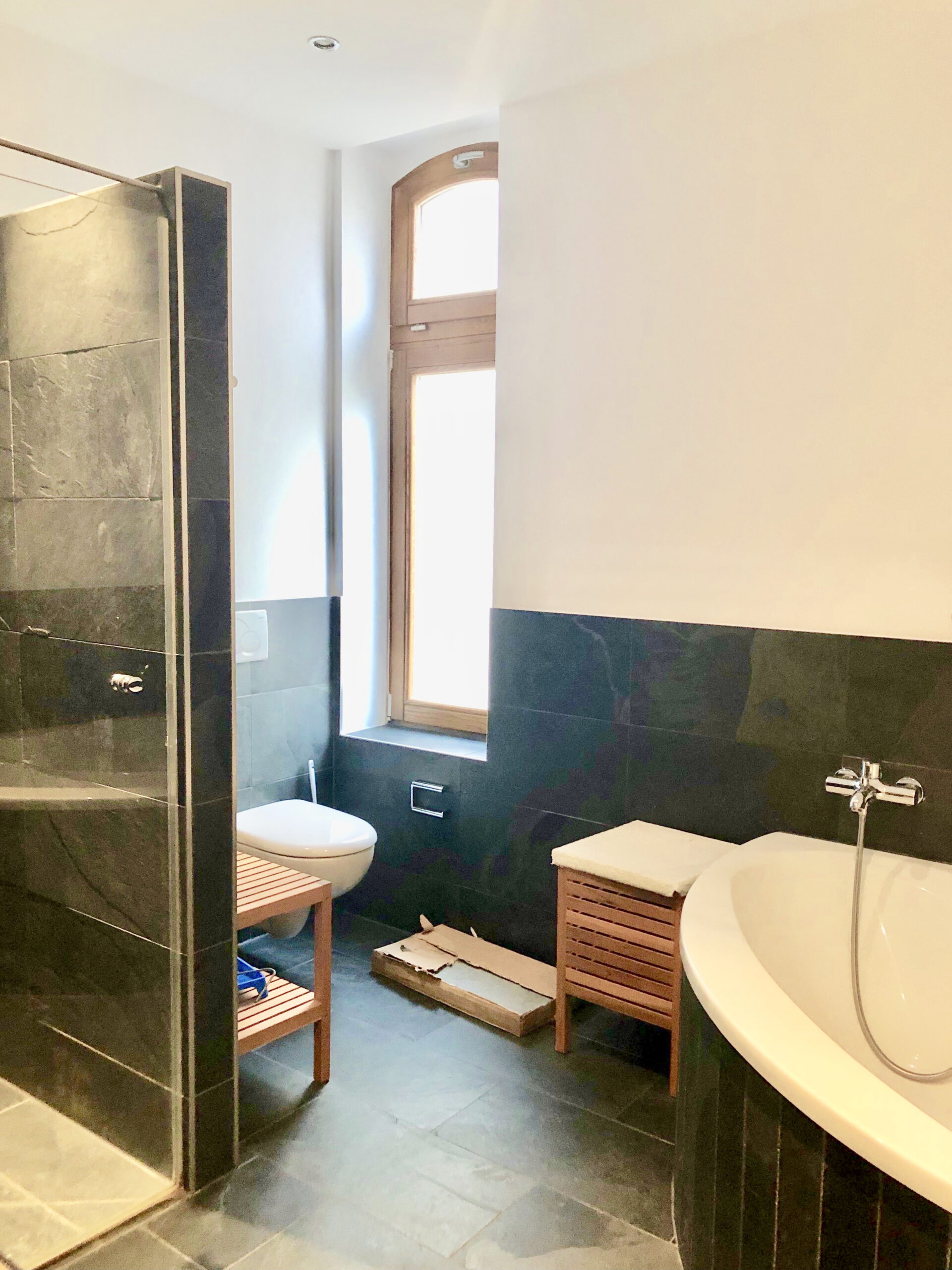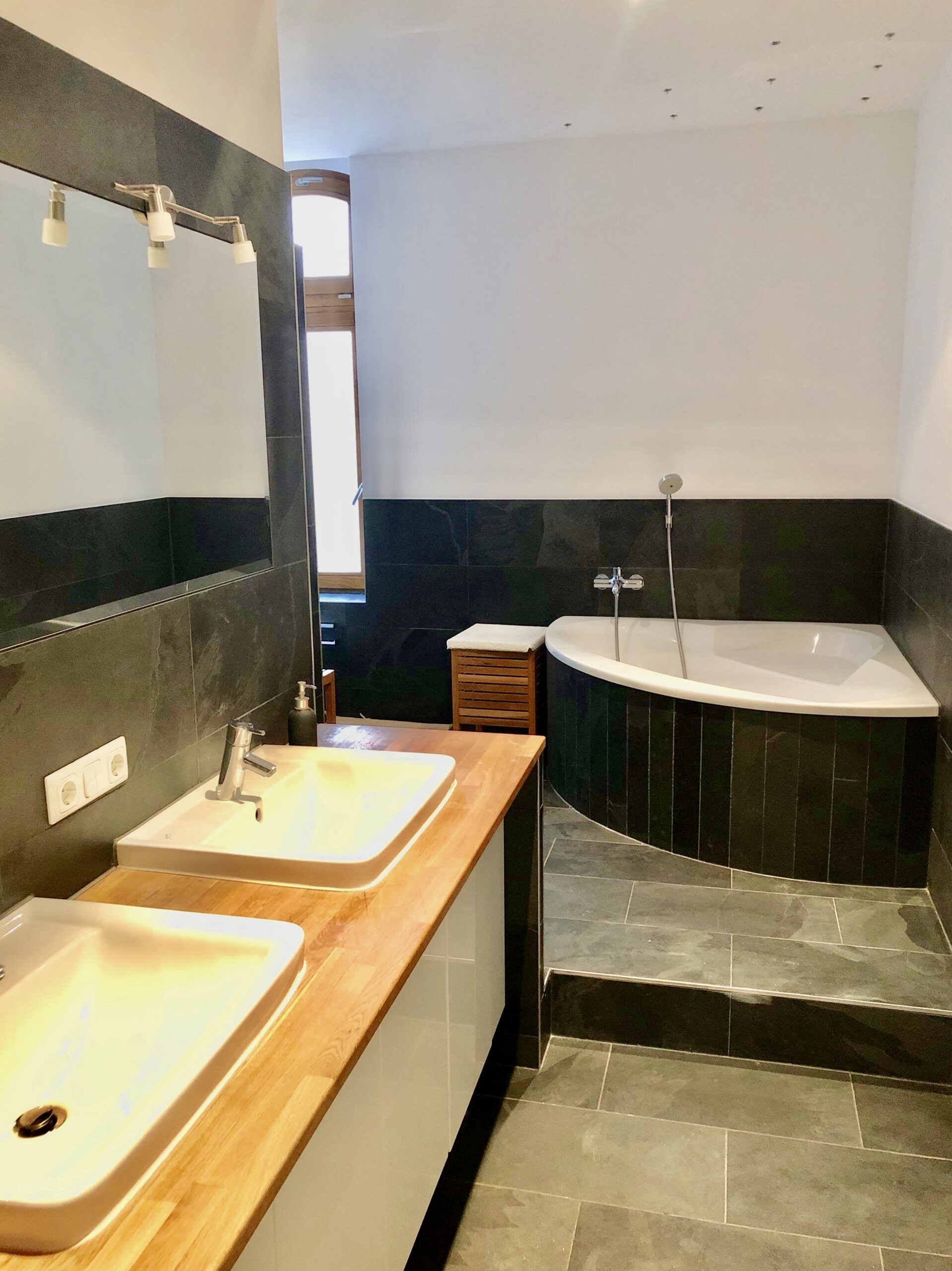 The large daylight bathroom, featuring a corner bathtub, walk-in shower, vanity units, and double sinks, offers a luxurious atmosphere. The smaller shower room provides space for a washing machine and dryer. Both bathrooms are finished with natural slate tiles and fitted with recessed lighting.