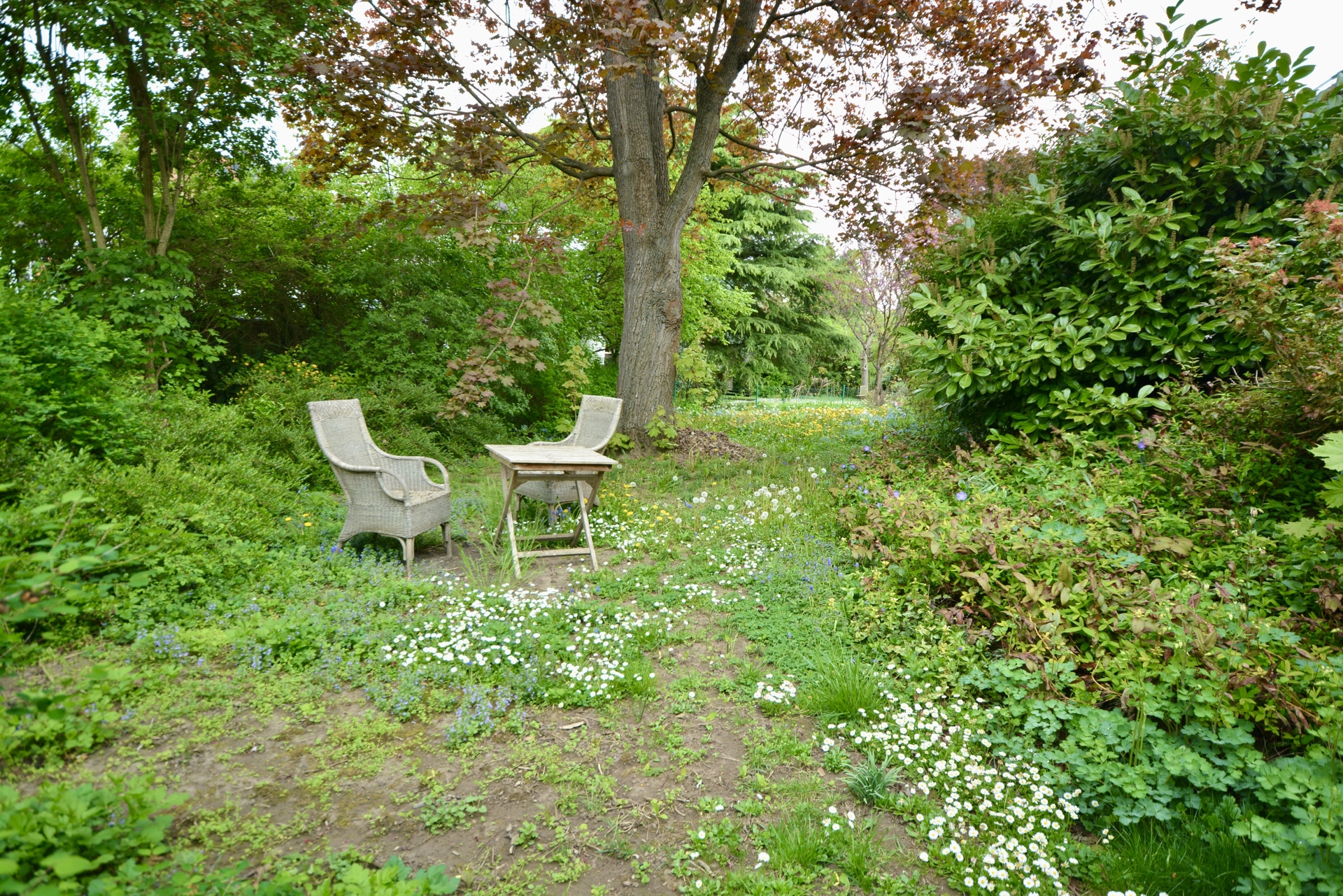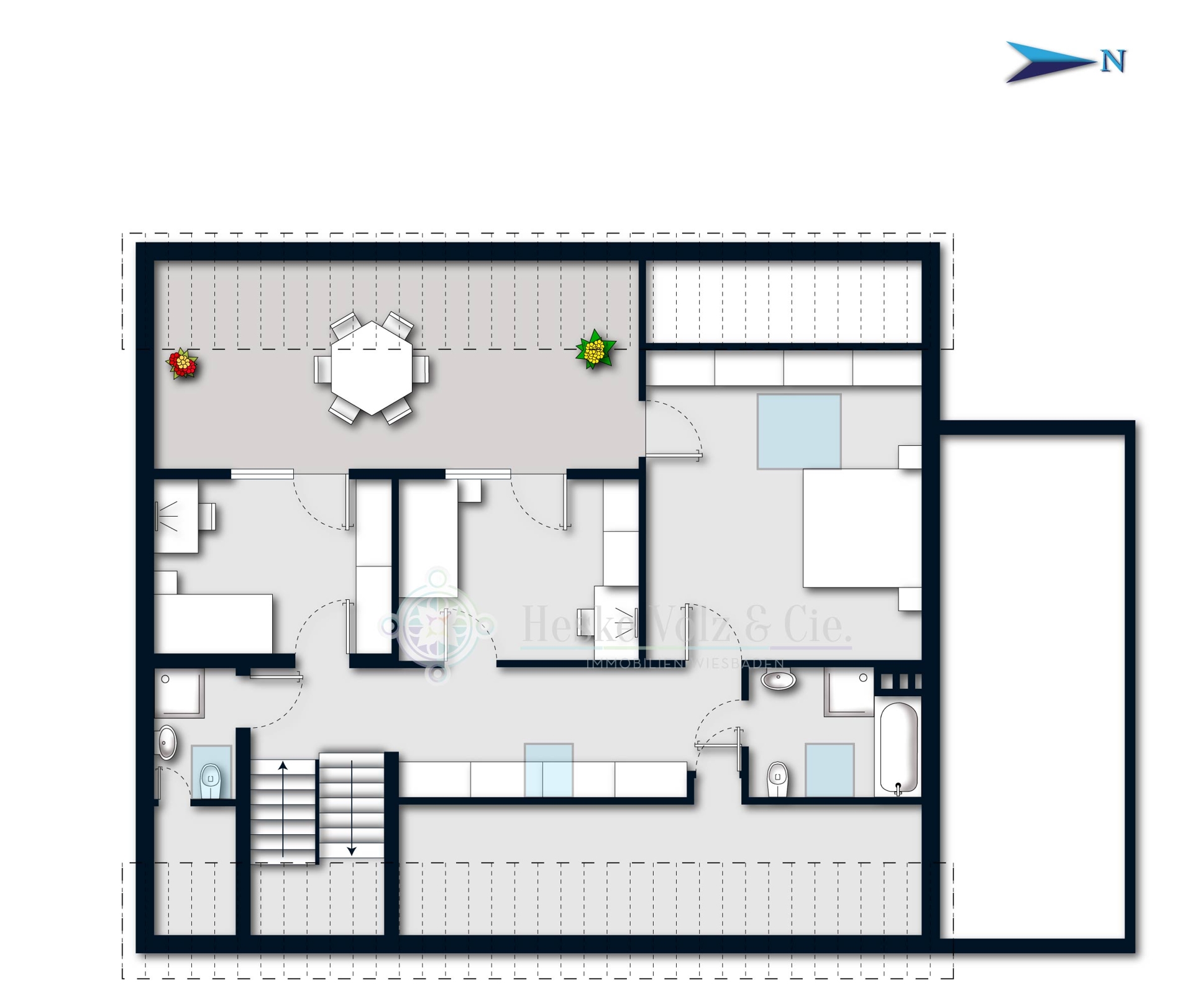 Die Immobilie verfügt über zwei Terrassen: Eine große Terrasse im Erdgeschoss mit direktem Zugang über eine Treppe in den Garten, sowie eine sonnige Loggia im Dachgeschoss, die zum Entspannen und Verweilen einlädt.
