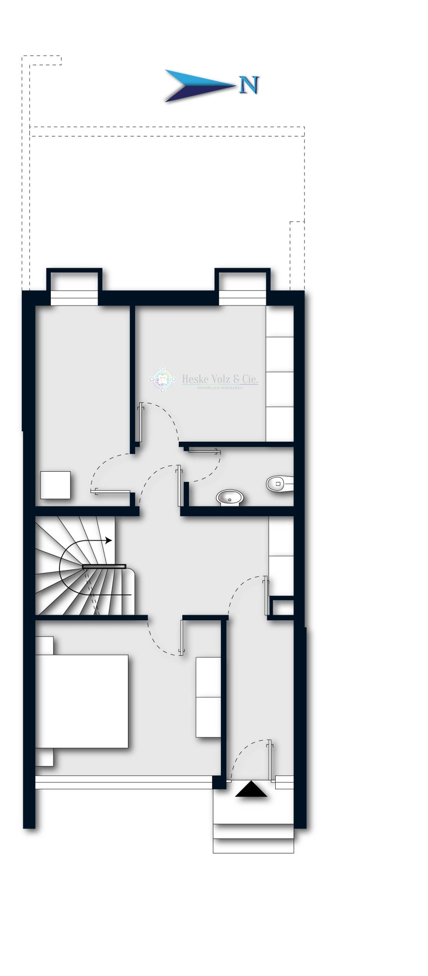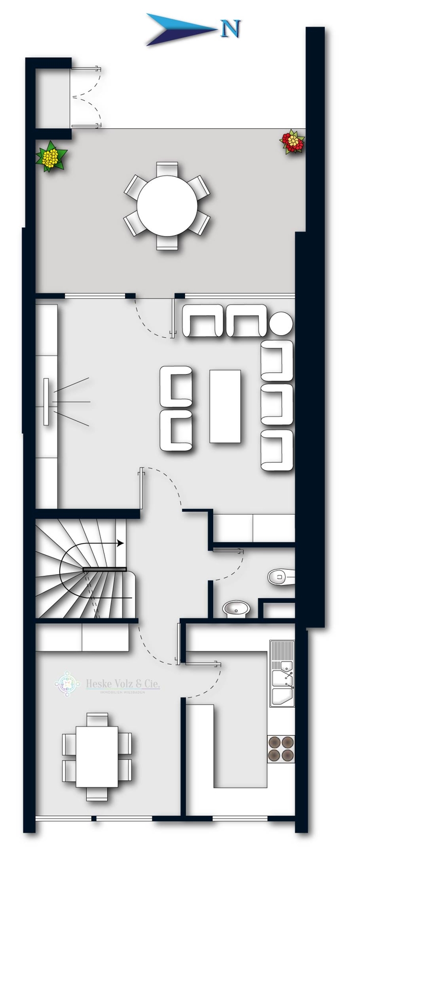 Das erste Obergeschoss bildet den zentralen Wohnbereich des Hauses mit einem geräumigen Wohnzimmer und dem Zugang zur Terrasse und Garten. Das Esszimmer und die angrenzende Küche bieten viel Platz für gemütliche Abende. Ein weiteres Gäste-WC ist auf dieser Etage ebenfalls vorhanden.