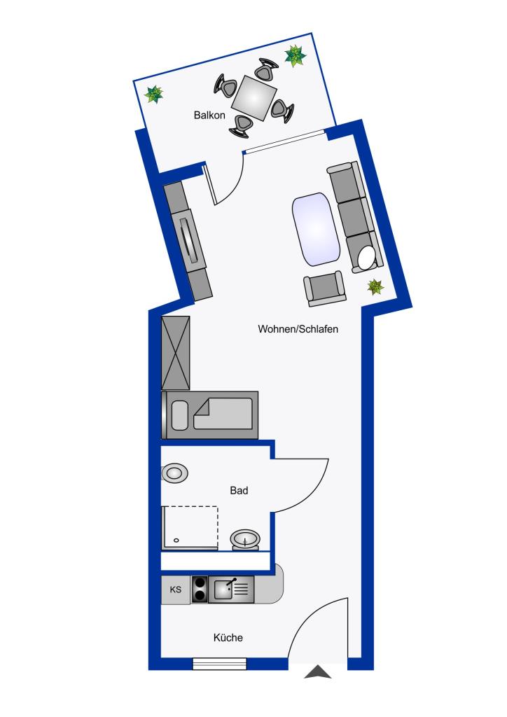 Im 2. Obergeschoss befindet sich die kleine Wohnung mit geschicktem Grundriss: kleine Küche, Bad und ein Wohn-Schlafraum mit Balkon auf dem man die Abenddämmerung über dem Rhein genießen kann.