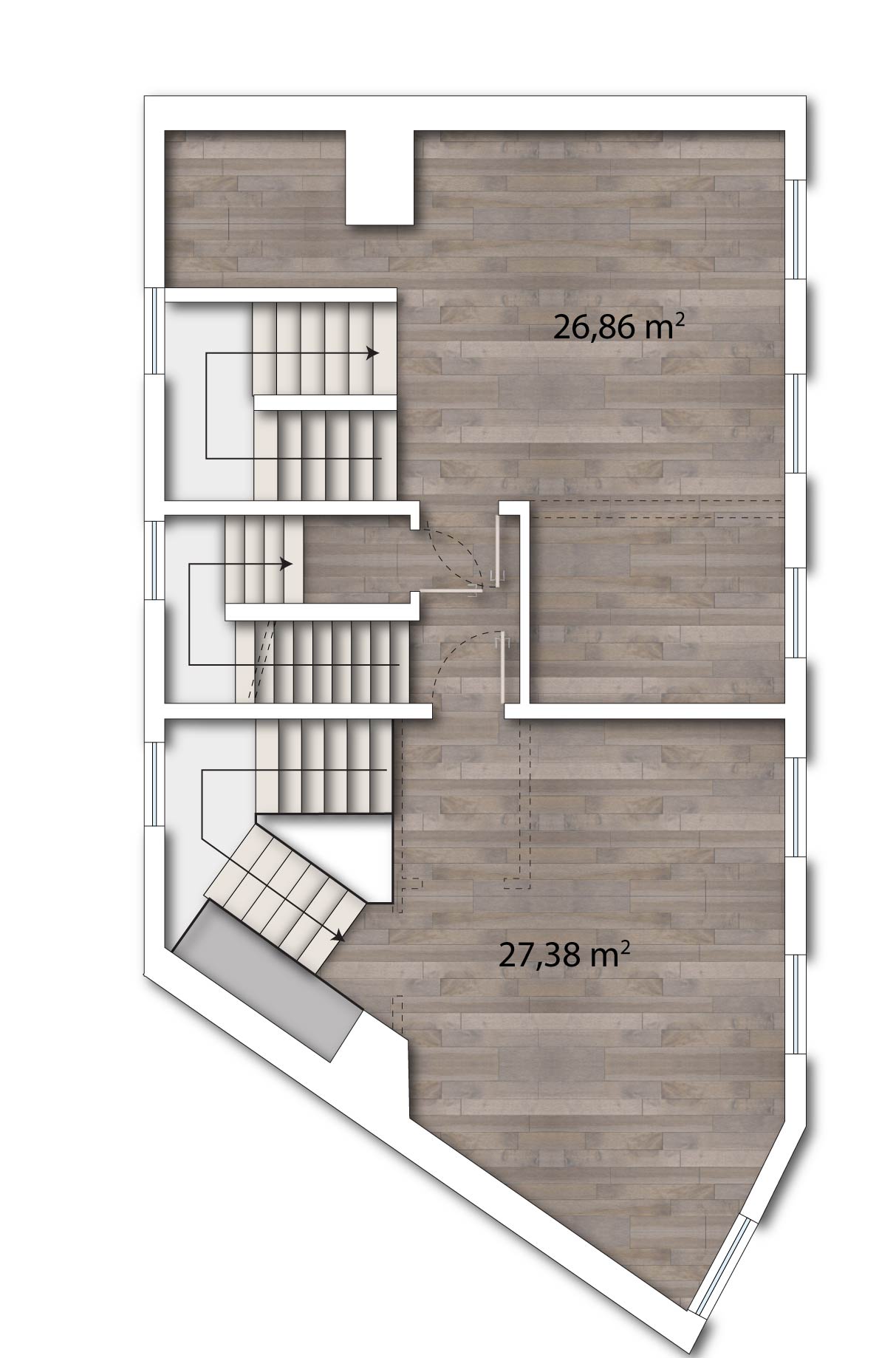 Die Gewerbeflächen sind jeweils auf zwei Etagen gleichmäßig verteilt. Die obere Etage ist über eine innenliegende Treppe erreichbar. Im Erdgeschoss befinden sie die jeweiligen Ausstellungsflächen, WC´s sowie Klimaanlagen. Auf den oberen Ebenen befinden sich die Teeküchen und die Lager.