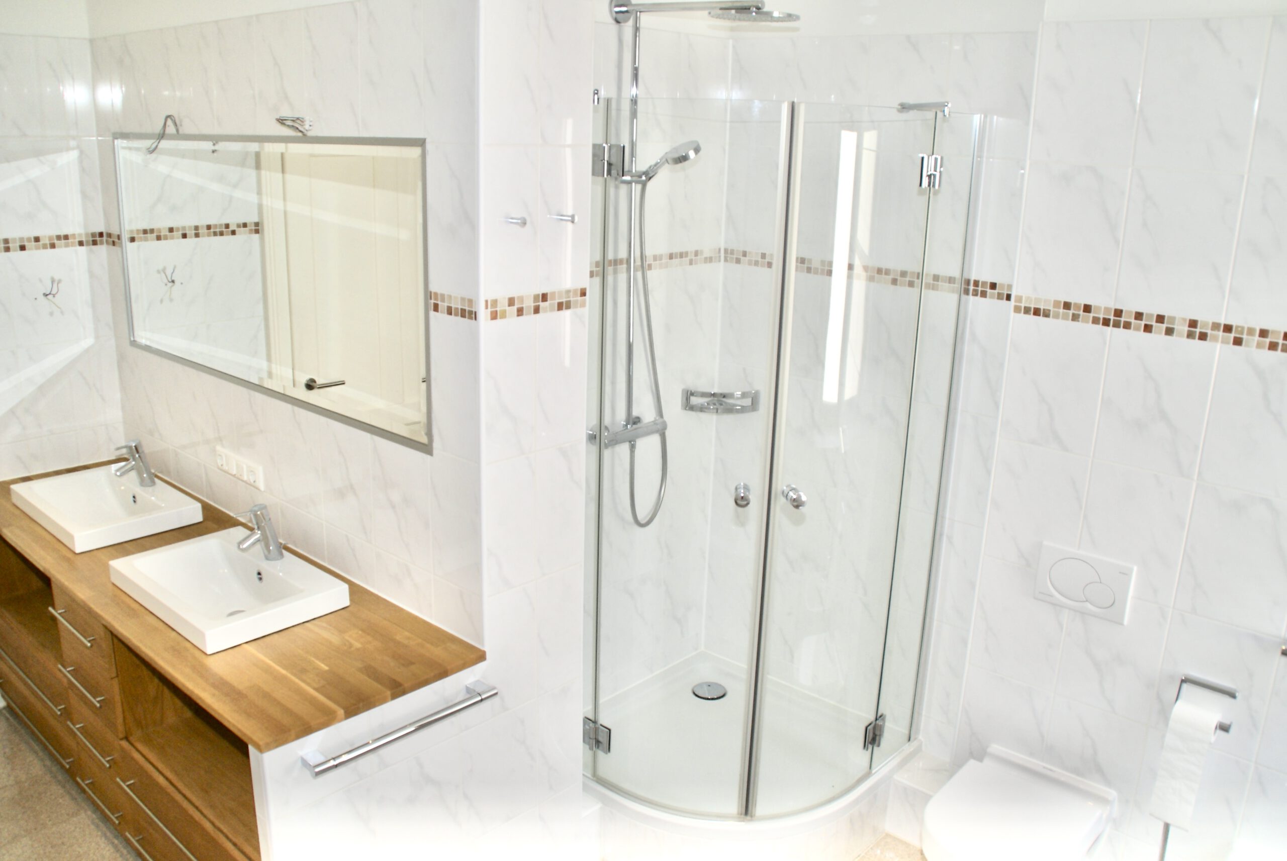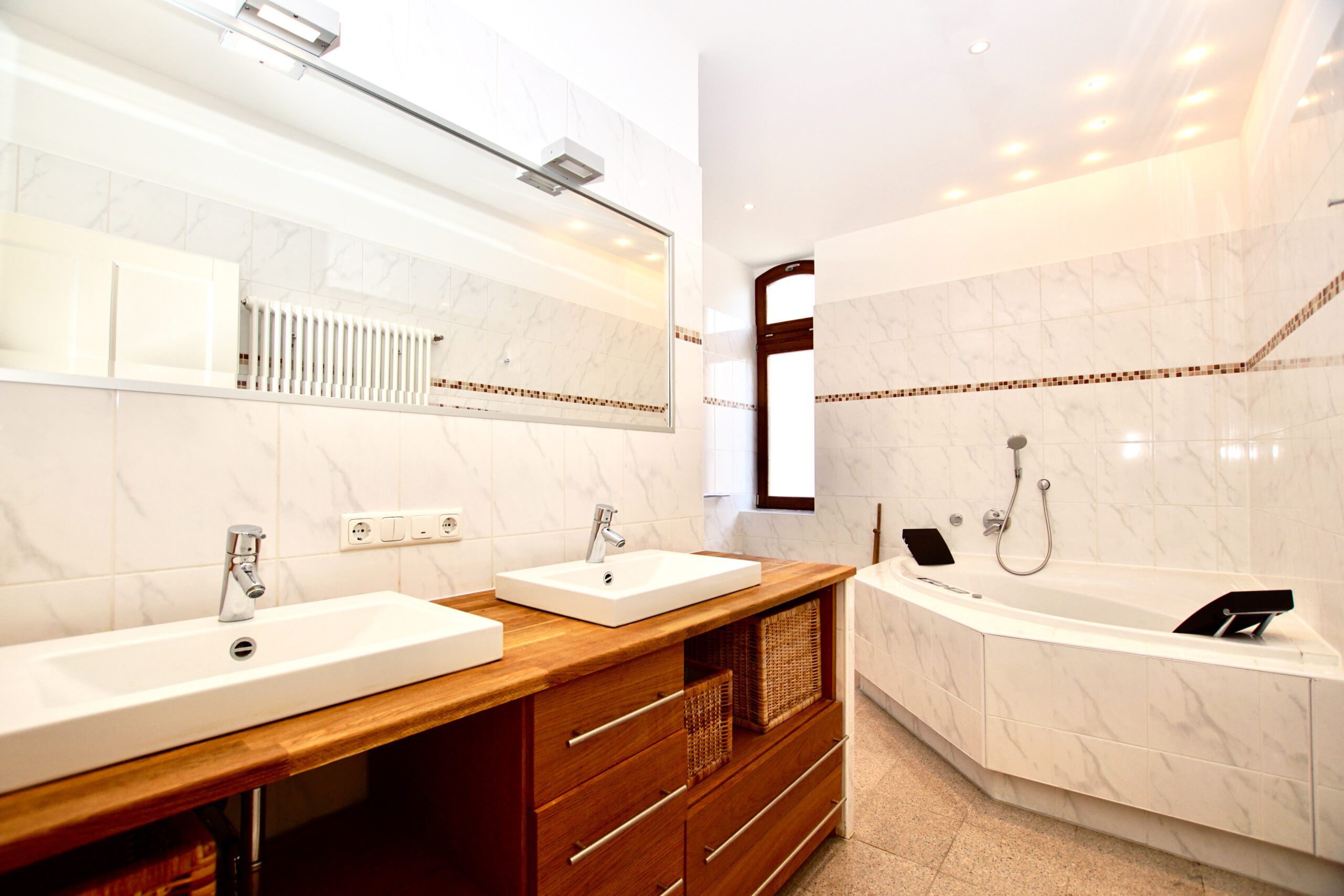 Ein Highlight der Wohnung ist das luxuriöse Tageslichtbad mit Eckbadewanne samt Whirlpoolfunktion, großzügiger Dusche, Doppelwaschtisch, Einbauspiegel, Unterschrank und stimmungsvoller Beleuchtung. Ein separates Duschbad – ebenfalls mit Tageslicht – liegt im Kinderbereich und ist zusätzlich mit Waschmaschine und Trockner ausgestattet. Eine separate Gäste-Toilette sorgt für zusätzlichen Komfort.