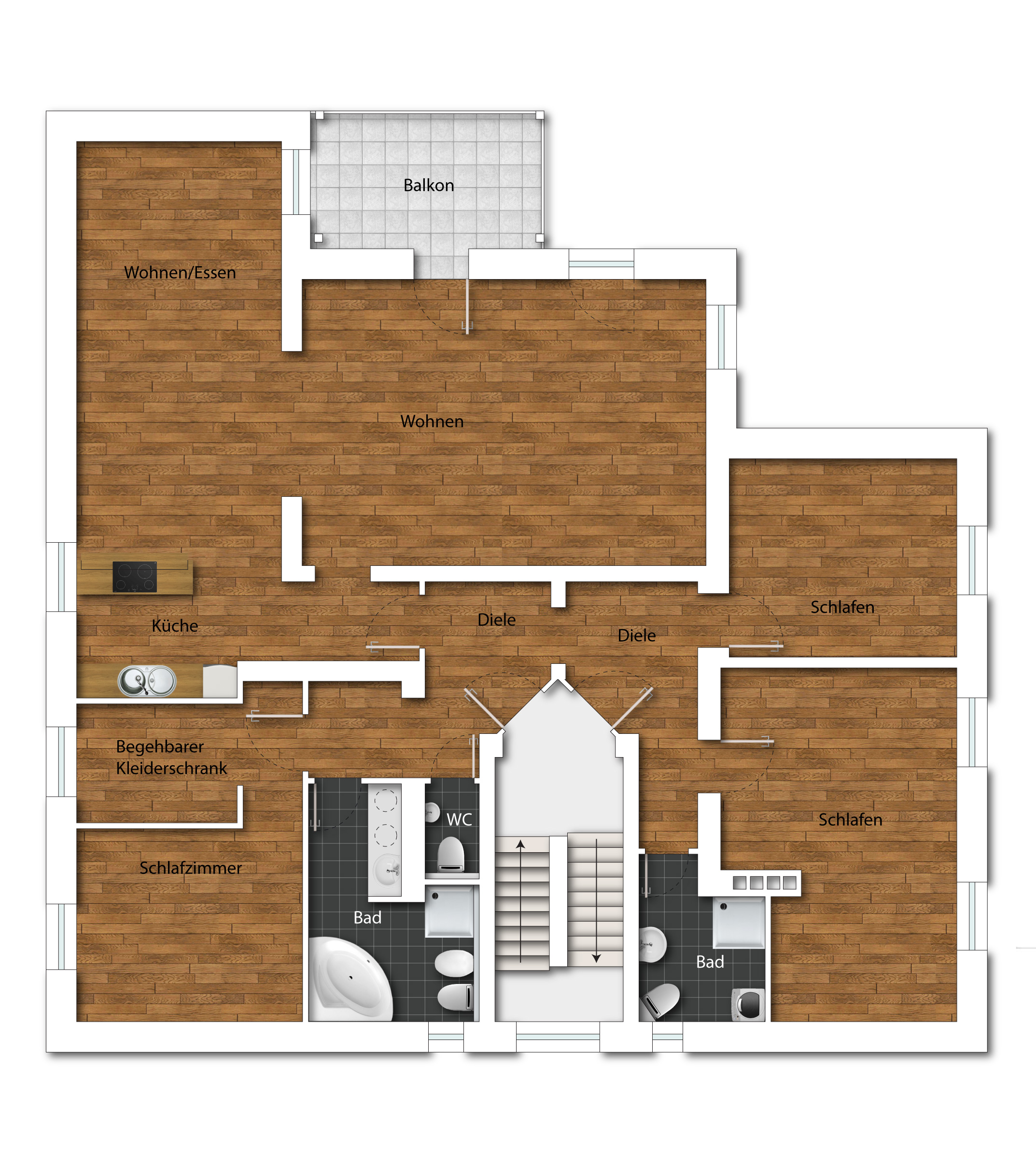 Die Grundrissgestaltung schafft durchdachte Rückzugsorte: Der Elternbereich ist direkt an das große Hauptbad angebunden, während zwei weitere Schlafzimmer und ein Duschbad den idealen Bereich für Kinder, Gäste oder Homeoffice bilden.