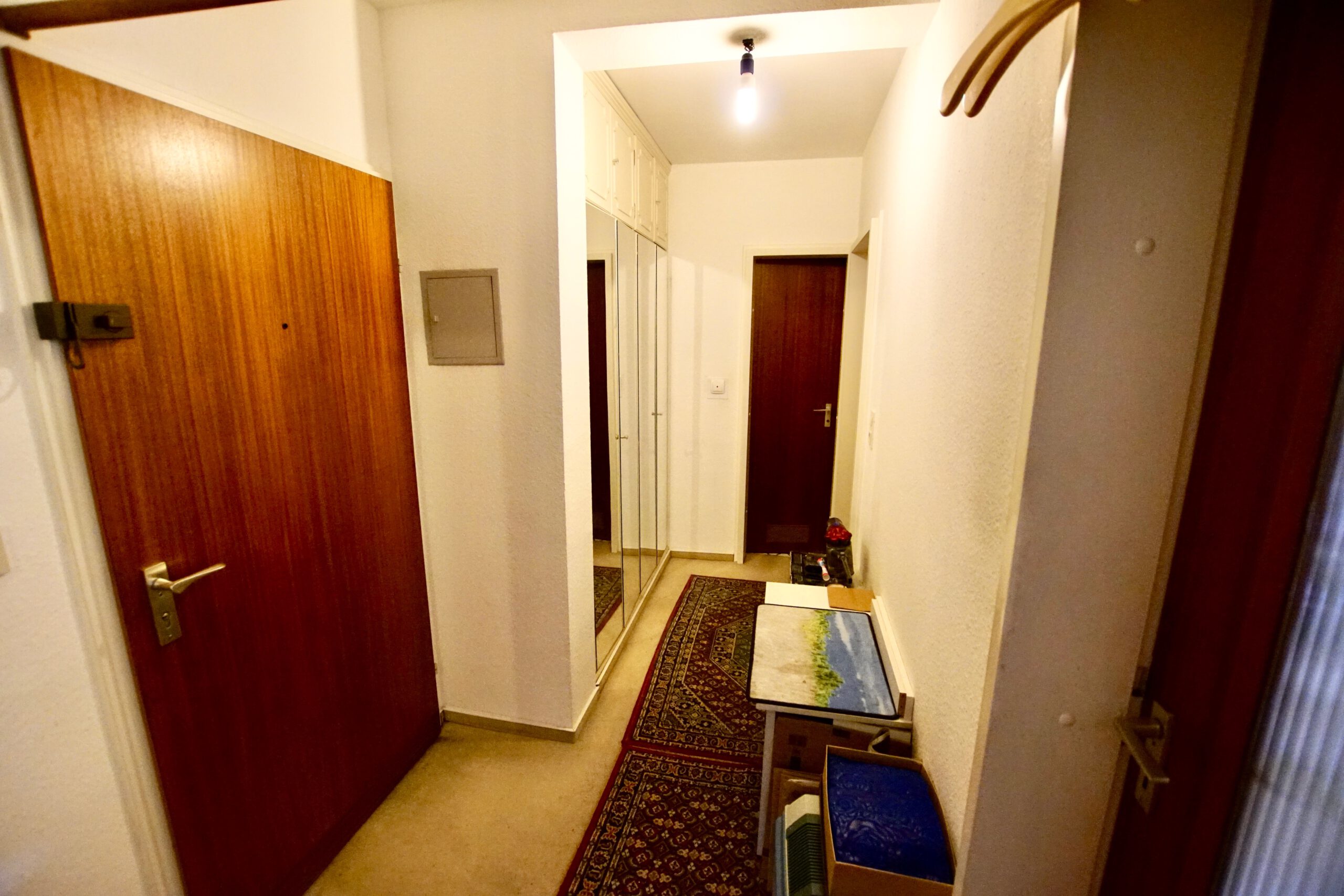 Das kompakte Duschbad ist zweckmäßig gestaltet, während der großzügige Flur zusätzlichen Stauraum oder Platz für eine Garderobe bietet.