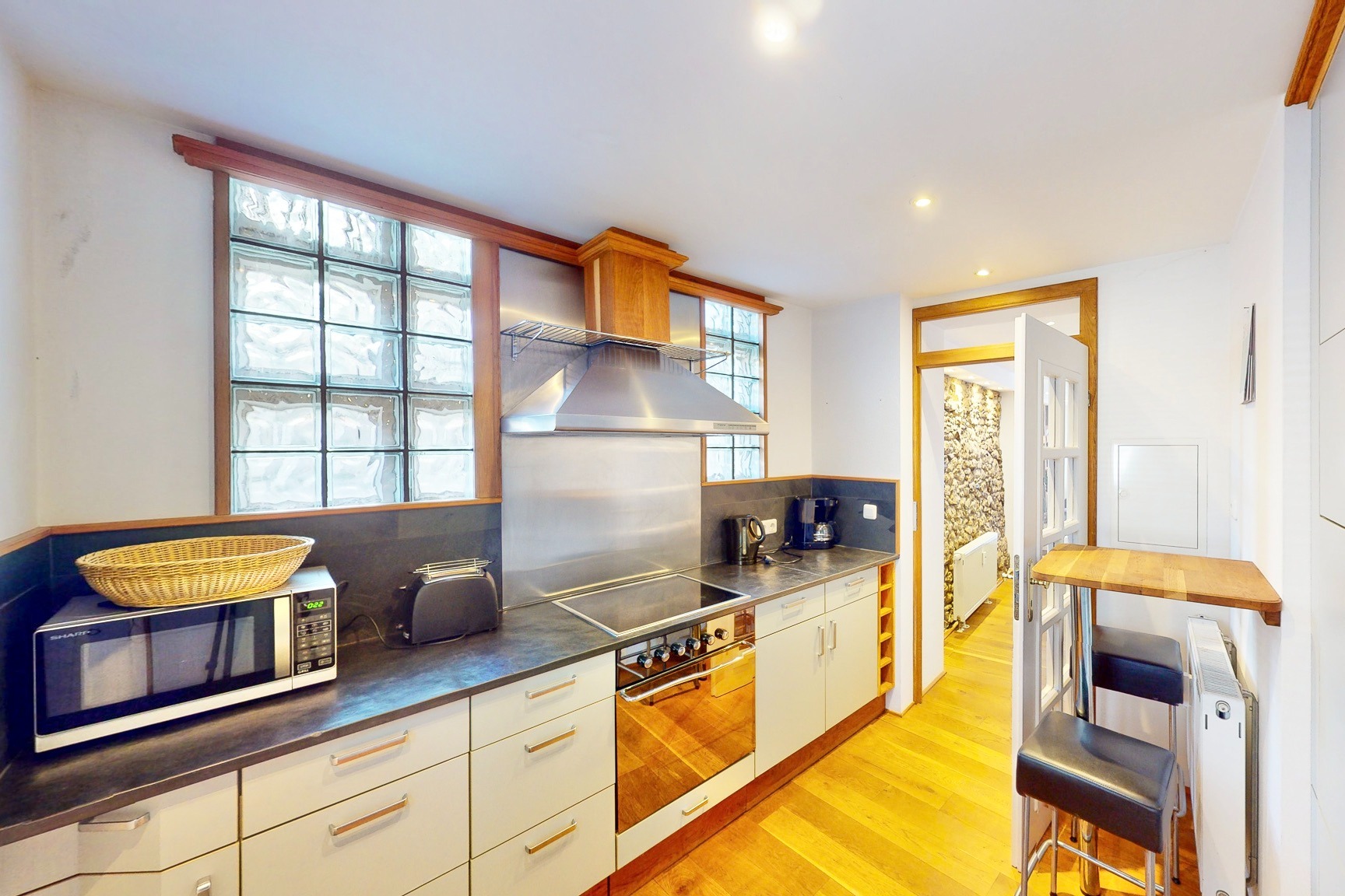 Die neun individuell gestalteten Wohneinheiten verfügen über hochwertige Einbauküchen, moderne Bäder mit Naturstein und massive Eichendielen in den Wohn- und Schlafbereichen. Doppelt verglaste Holzfenster sorgen für eine angenehme Wohnatmosphäre. Der malerische Innenhof zwischen den Häusern steht der Allgemeinheit zur Verfügung lädt zum Beisammensein ein.