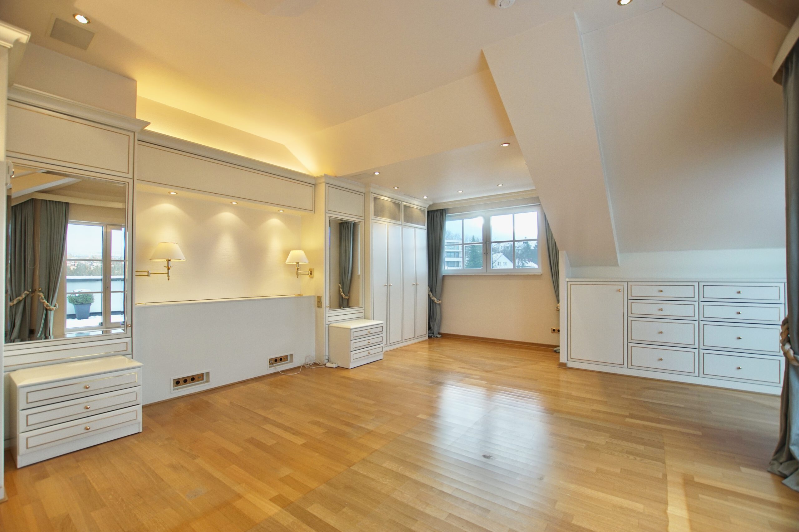 Über den Aufzug oder die innenliegende Treppe gelangen Sie in den offenen Schlafbereich mit herrlichem Ausblick. Ein separates WC befindet sich direkt am Schlafzimmer. Das große Master-Bad ist mit Dusche, Wanne, WC, Bidet, Doppelwaschbecken und Schminktisch ausgestattet. Der sich daran anschließende begehbare Kleiderschrank verfügt über eine Großzahl an Schränken für eine große Garderobe.