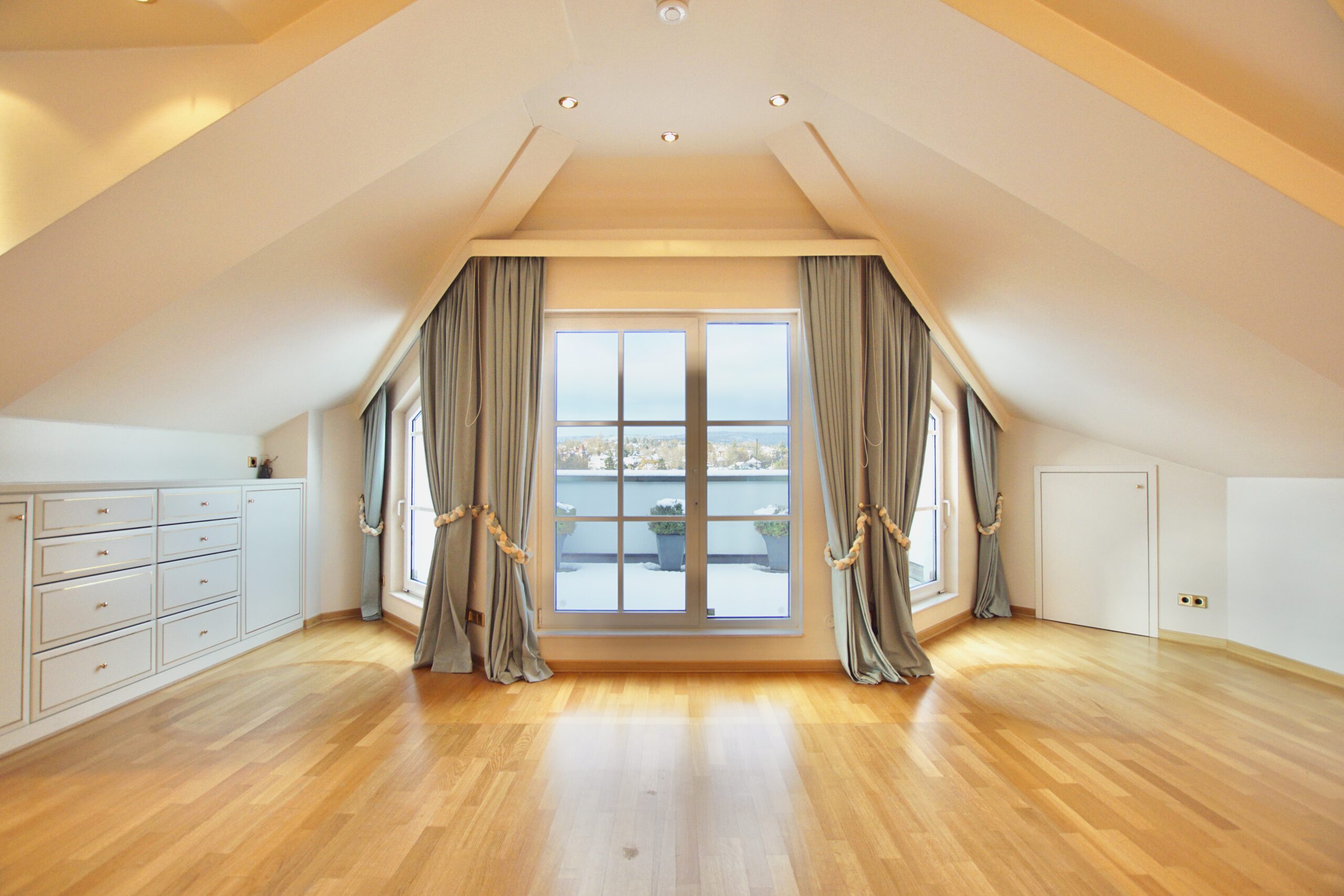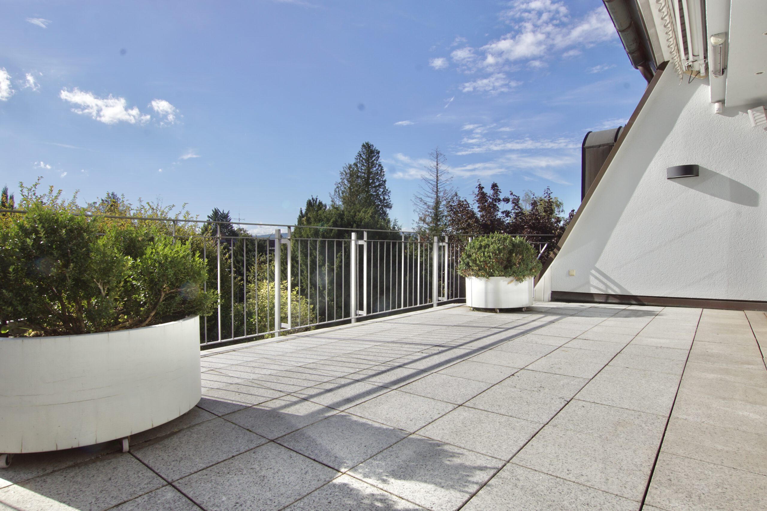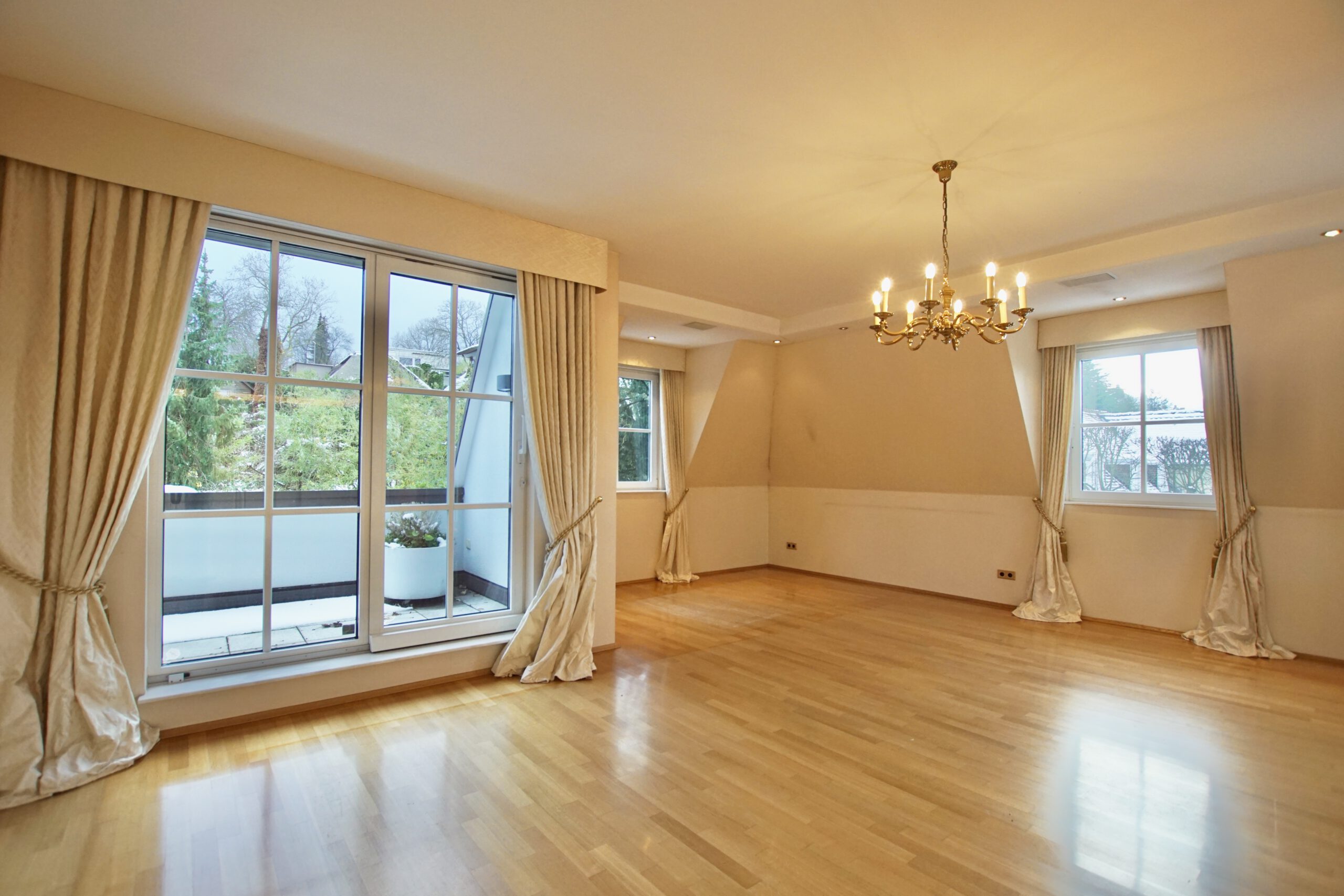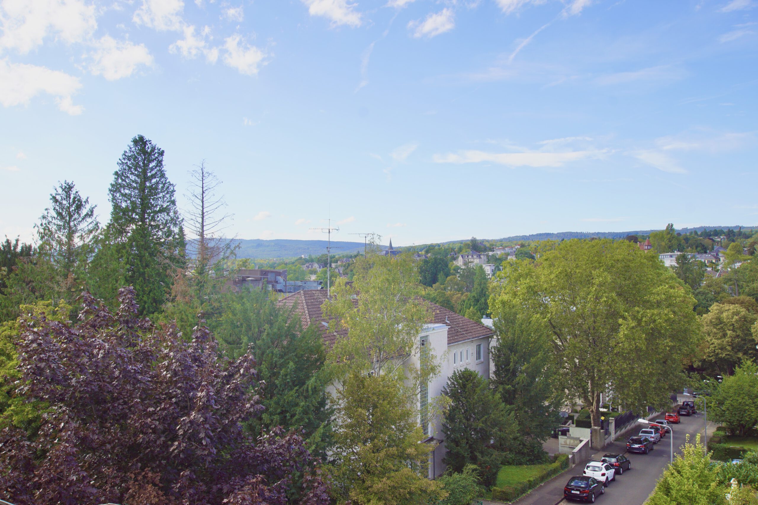 Durch die vielen bodentiefen Fenster und die vier Balkone genießen Sie einen herrlichen Blick über die Dächer der Stadt Wiesbaden.