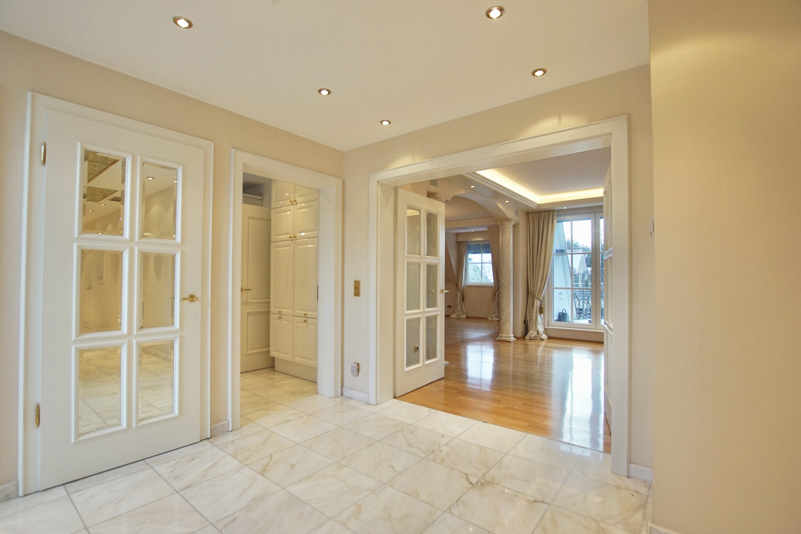 Entering the apartment, you come to the bright hallway with direct access to the living-dining room with two balconies, real wood parquet flooring, marble fireplace, columns and indirect lighting on the walls. The kitchen tiled with light marble is equipped with high quality electrical appliances, a side by side refrigerator/freezer and direct access to the balcony. The office is fully equipped with fine wooden shelves and sideboards. A bedroom with an en-suite bathroom in light tile with a bathtub completes the main floor.
