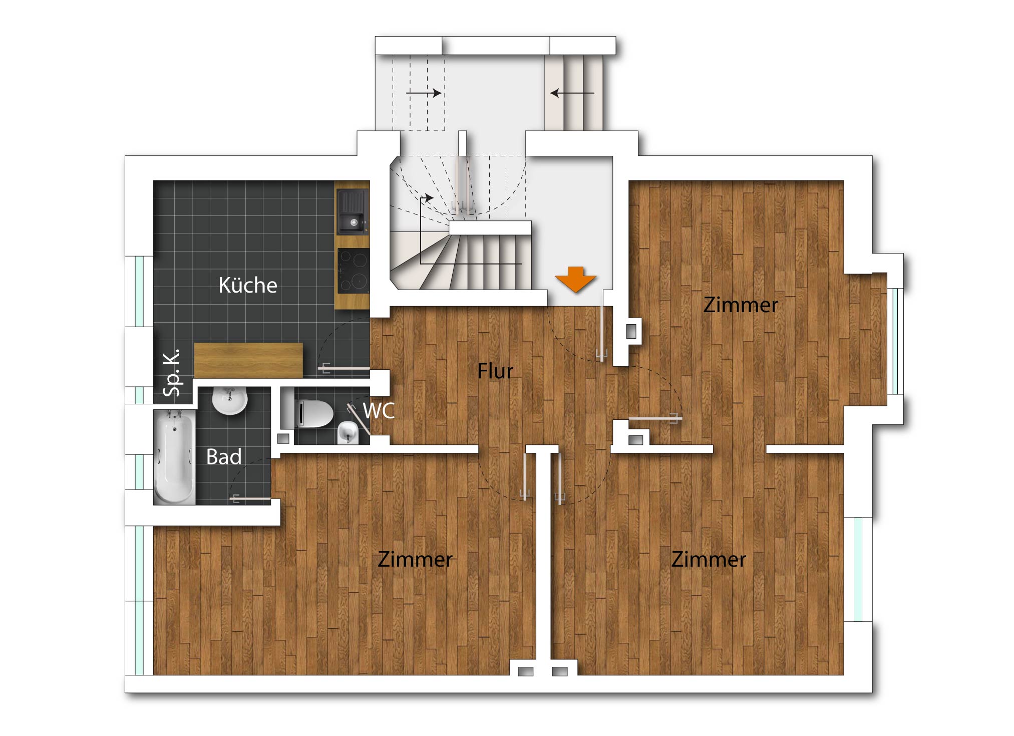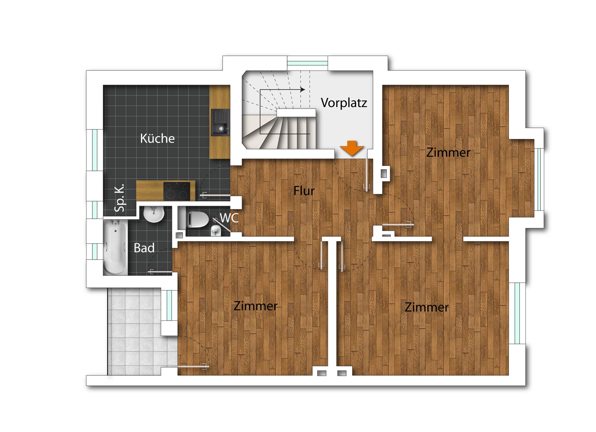 Jede der drei Wohneinheiten verfügt über drei gut geschnittene Zimmer, eine separate Küche, ein Badezimmer sowie ein separates WC.