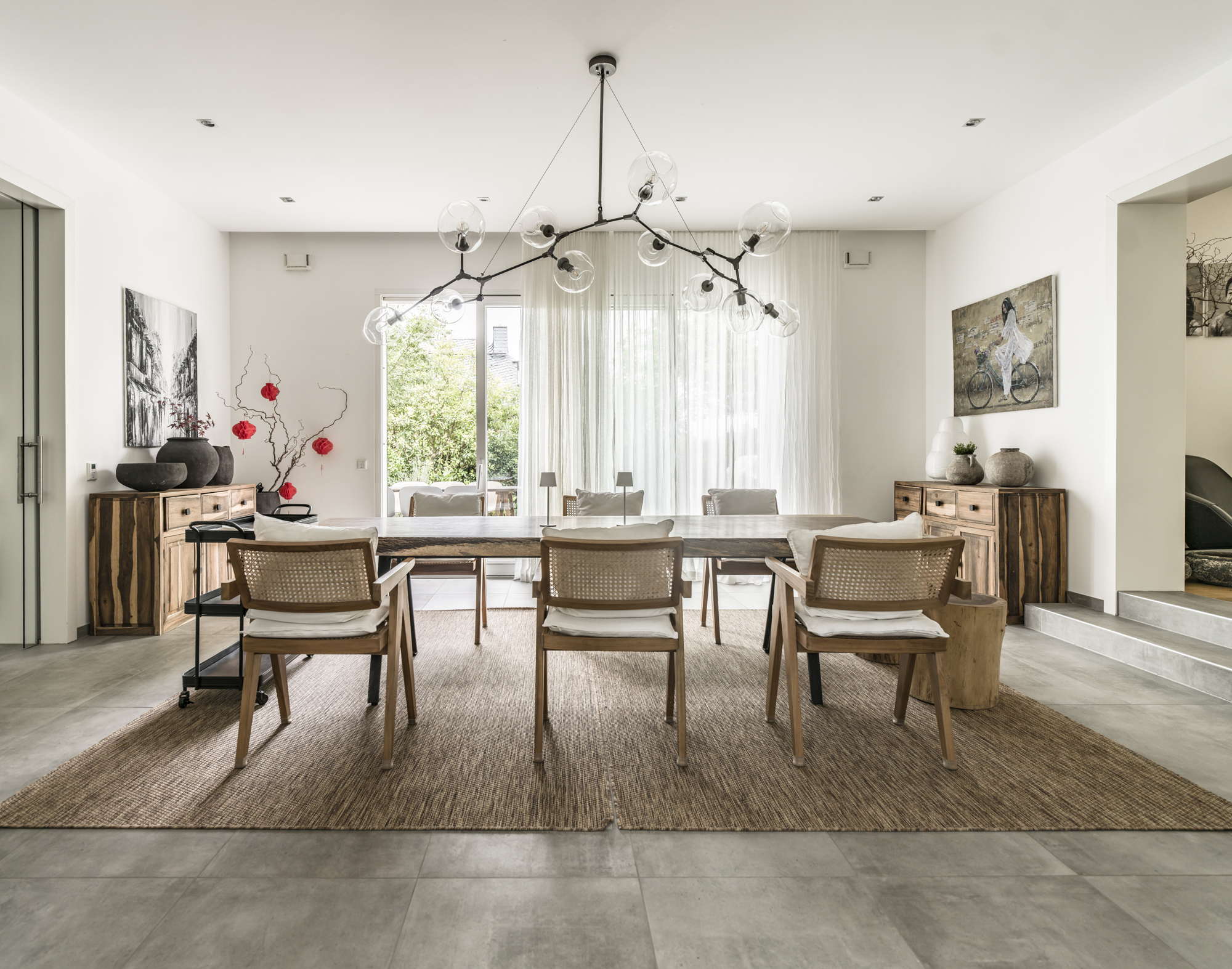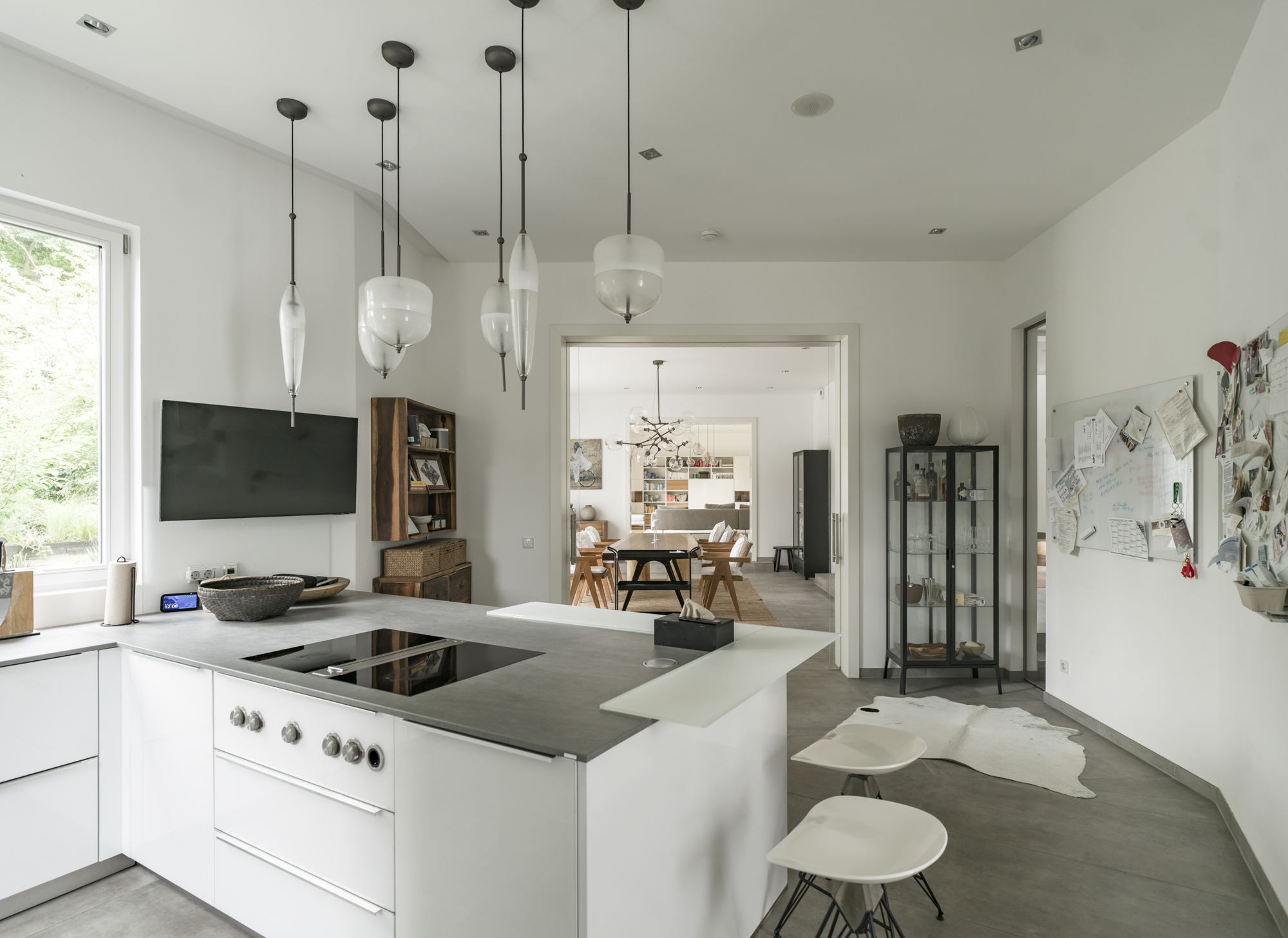 Der großzügige, lichtdurchflutete Wohn- und Essbereich bildet das Herzstück des Hauses. Eine offene, moderne Küche mit hochwertigen Geräten lädt hier zu geselligen Kochabenden ein. Der direkte Zugang zur Terrasse, schafft einen nahtlosen Übergang zum Außenbereich und erweitert den Wohnraum ins Freie.