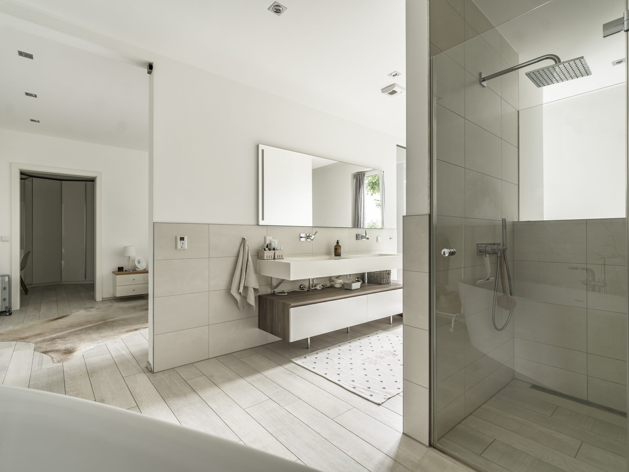 Hier befinden sich das Elternschlafzimmer sowie 3 Kinderzimmer sowie drei zeitlos modern gestaltete Badezimmer teilweise mit Badewanne und jeweils mit begehbarer Dusche.