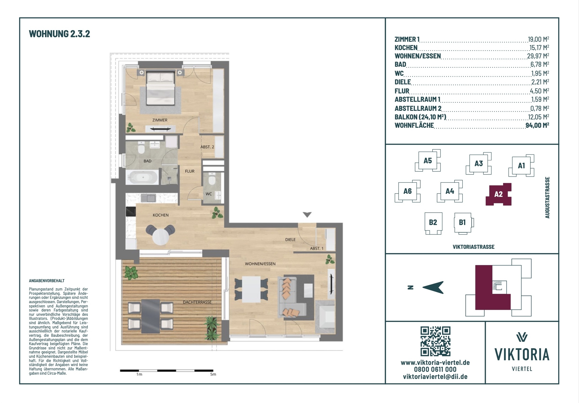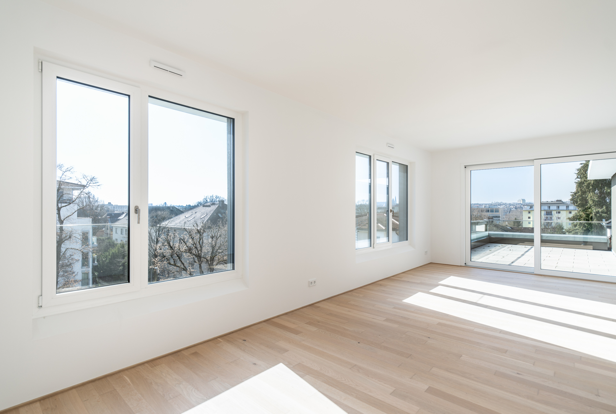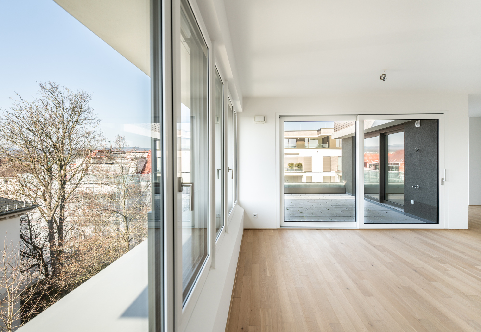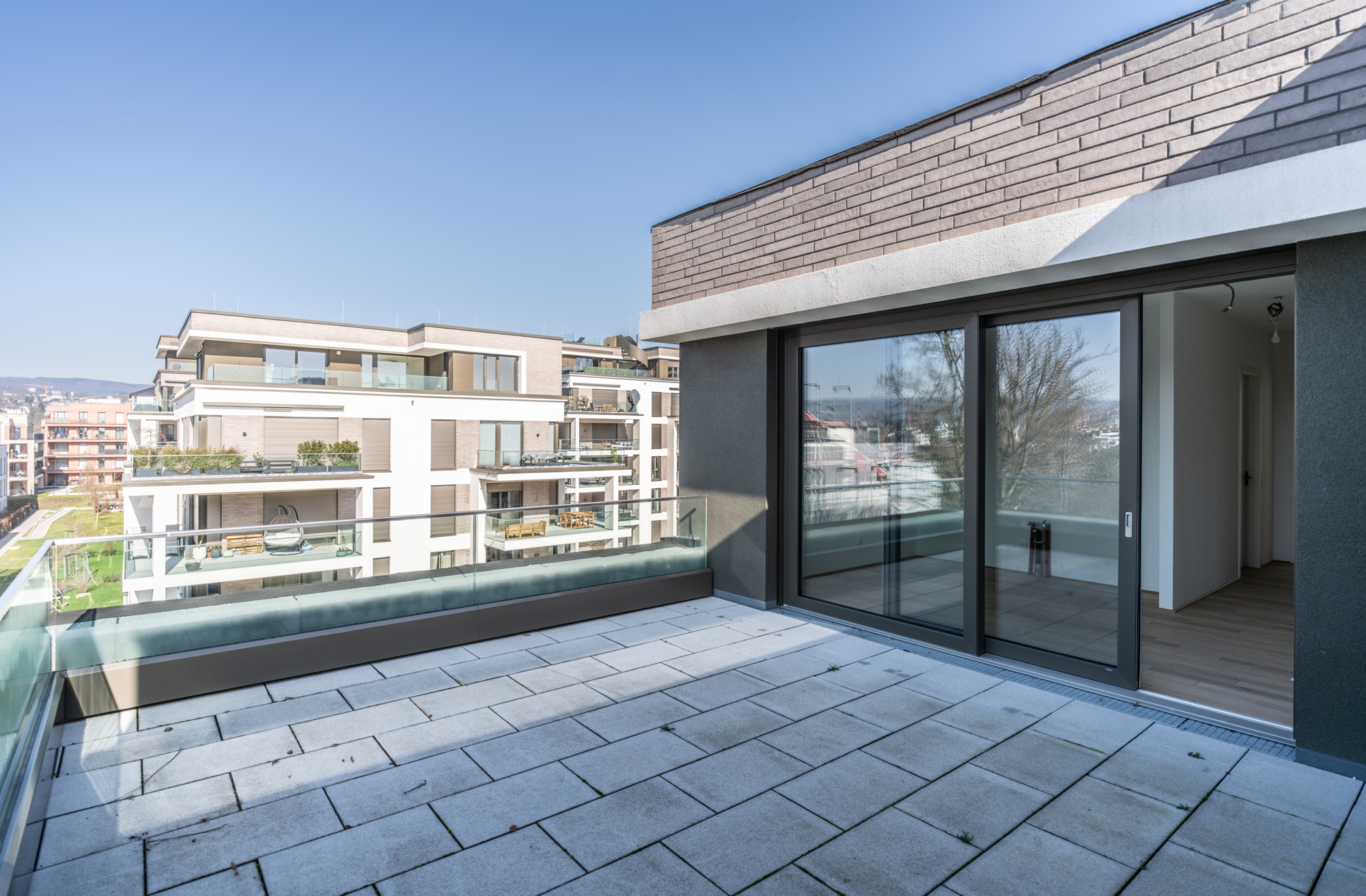 Die ca. 24 mÂČ groĂe Dachterrasse erweitert den Wohnraum ins Freie und lĂ€dt zu entspannten Stunden mit Blick ĂŒber die Stadt ein. Die Wohnung ist barrierefrei gestaltet, bequem per Aufzug erreichbar und verfĂŒgt ĂŒber zwei TiefgaragenstellplĂ€tze, die zur Wohnung gehören. Modernen Komfort bietet zudem die individuell steuerbare FuĂbodenheizung in allen RĂ€umen. Elektrische Aluminium-RolllĂ€den, eine Smart-Home-Vorbereitung sowie Fenster und WohnungstĂŒr mit erhöhtem Sicherheitsstandard runden das hochwertige und zukunftsorientierte Ausstattungskonzept ab.