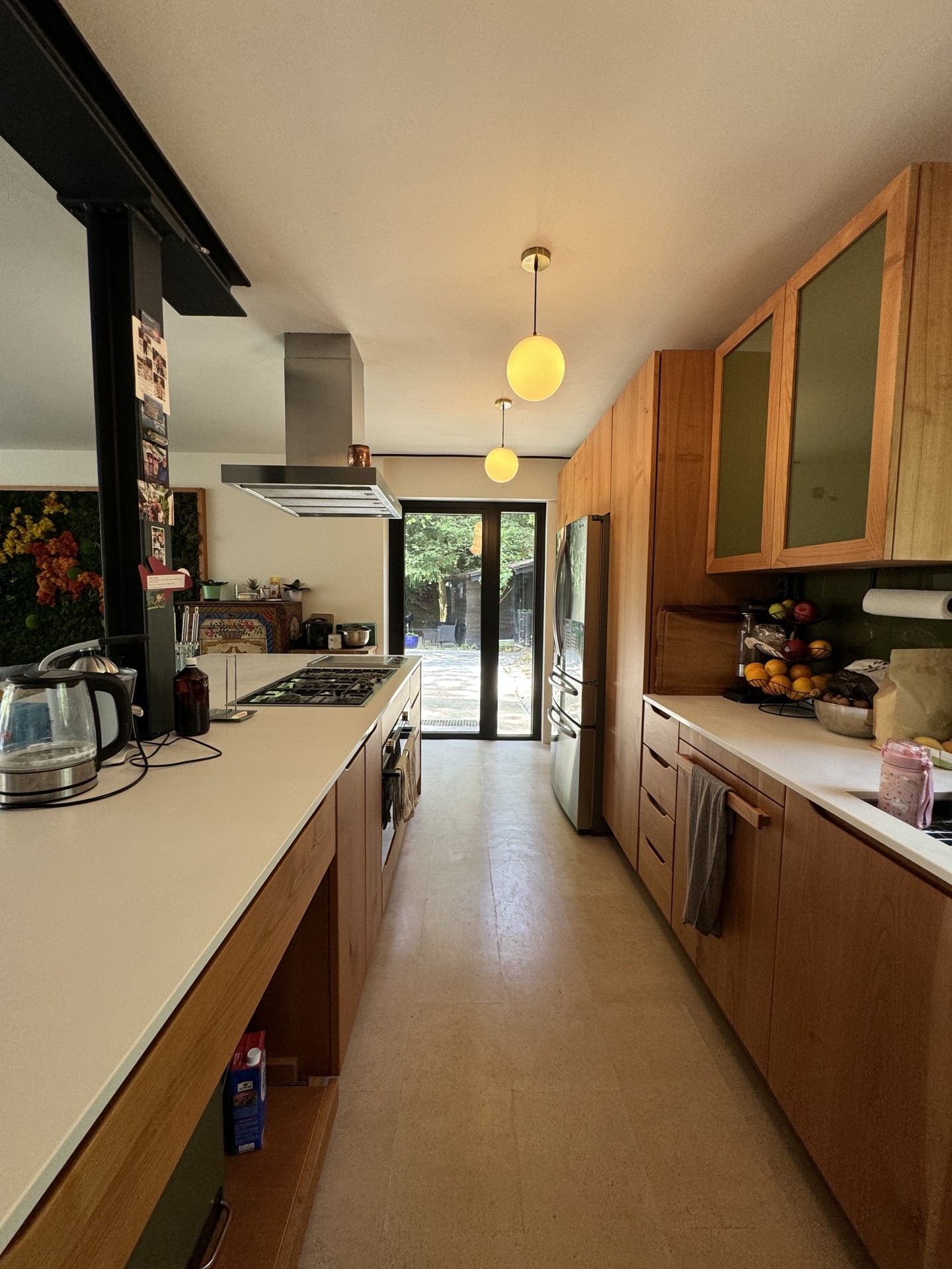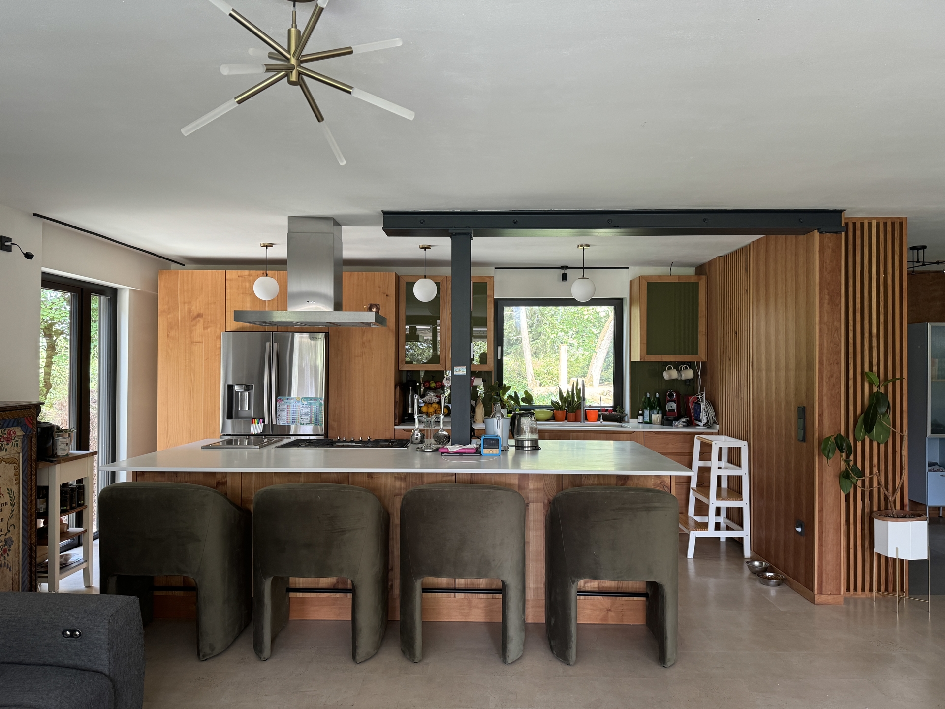 Dieses freistehende Einfamilienhaus, das um 1970 erbaut und im Jahr 2021 umfassend und hochwertig saniert wurde, bietet auf rund 200 m² Wohnfläche modernen Komfort und Flexibilität. Die großzügige und exklusive Einbauküche aus massivem Kirschholz bildet mit einer großen Kochinsel und einem amerikanischen Kühlschrank das Herzstück des Hauses und lädt zu geselligen Kochabenden ein. Der elegante Korkboden in Dielenoptik und ein stilvoller Kamin im Wohnzimmer verleihen dem Haus eine warme, einladende Atmosphäre.