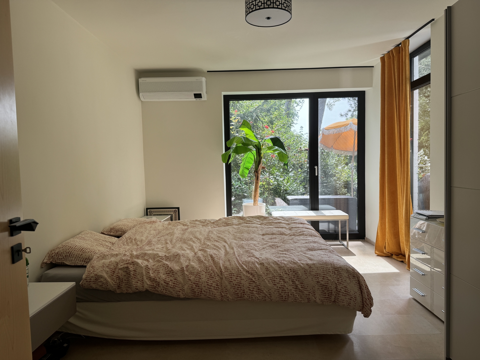 Im Obergeschoss befinden sich drei helle Schlafzimmer, die alle mit bodentiefen Fenstern ausgestattet sind und dadurch viel Tageslicht bieten. Die zwei modern gestalteten Bäder, die mit Oberlichtern für eine angenehme, natürliche Beleuchtung sorgen, wurden im Zuge der Sanierung erneuert. Ein zusätzliches Gäste-WC rundet das Raumangebot ab.