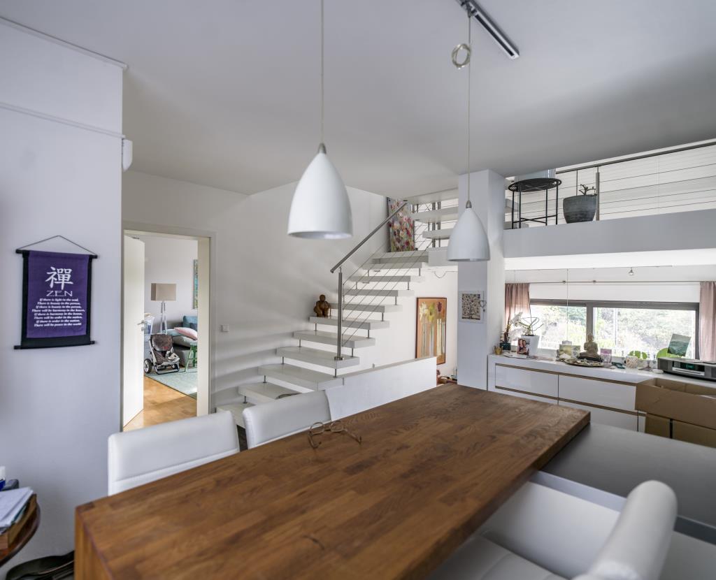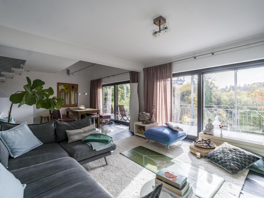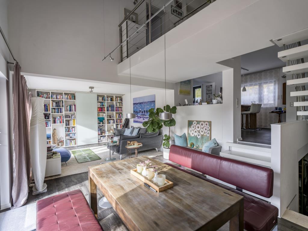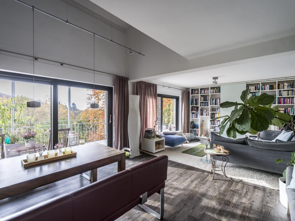 Das „AHA-Erlebnis“ kommt direkt nach dem Öffnen der Haustür, blickt man doch in einen großzügigen offenen Raum mit mehreren Ebenen und einem herrlichen Weitblick! Die geschickte Konzeption von Küche (Gaggenau-Geräte), Frühstückstheke und dem wunderbaren Wohnzimmer mit großzügigem Balkon bieten perfektes Wohnen auch für die größere Familie.