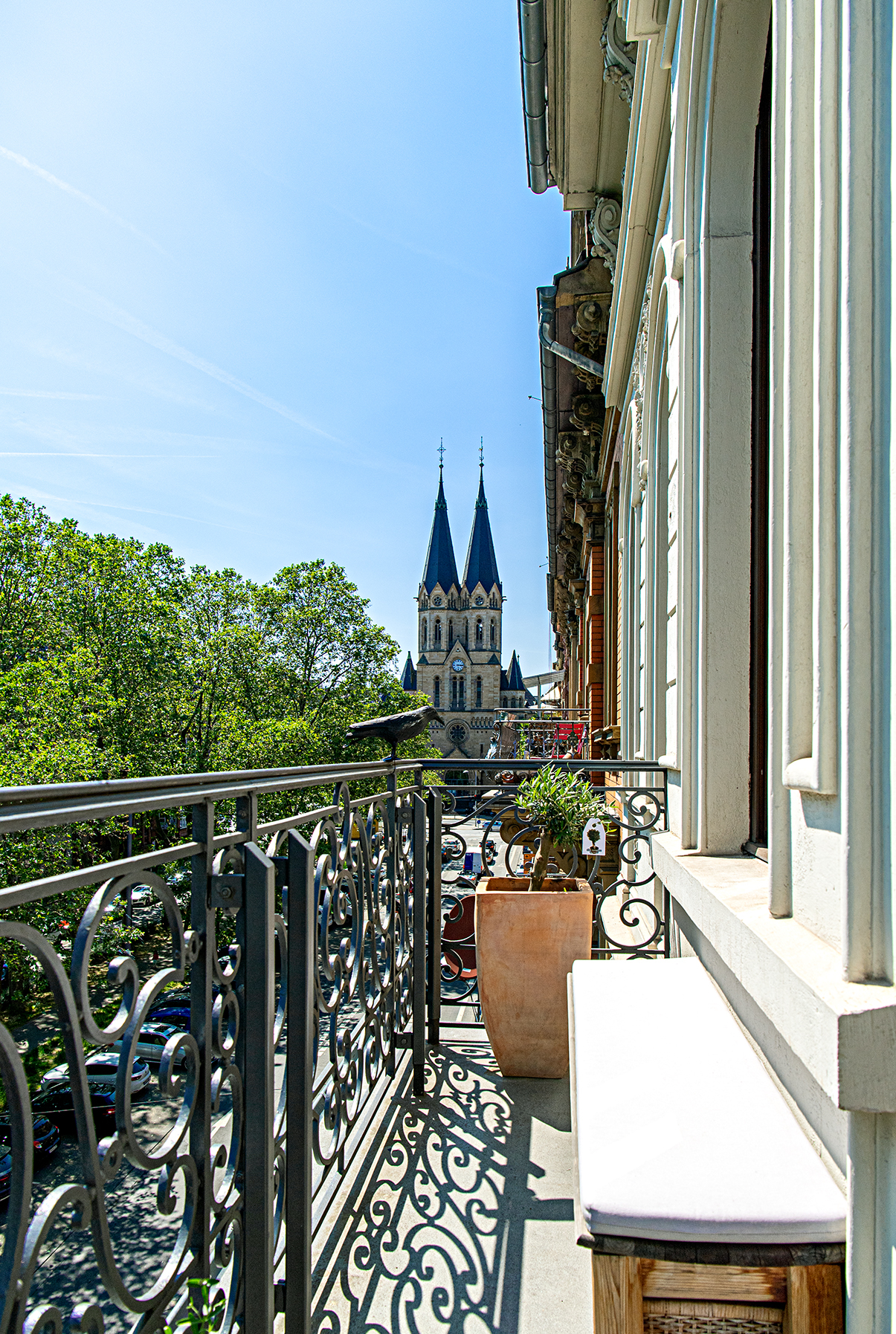 Ein Highlight ist der sonnige Balkon mit herrlichem Ausblick auf die Rheinstraße, eine der architektonisch beeindruckendsten Straßen Wiesbadens. Hier lässt sich das städtische Flair in vollen Zügen genießen – sei es beim Frühstück in der Morgensonne oder bei einem Glas Wein am Abend. Die Wohnung verfügt über ein großzügiges Wohnzimmer mit direktem Zugang zum Balkon, ein separates Esszimmer, zwei Schlafzimmer sowie eine vollständig ausgestattete Einbauküche. Das Tageslichtbad ist modern gestaltet und bietet sowohl eine Badewanne als auch eine Dusche.