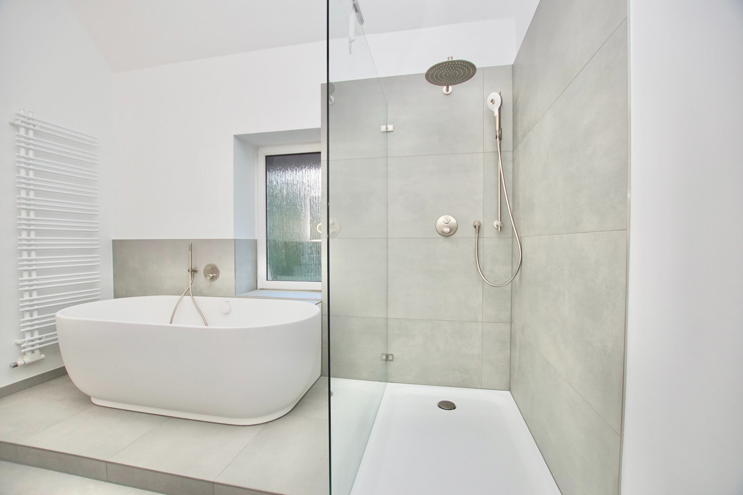 - Badausstattung: Dusche, Badewanne, Fenster im Badezimmer