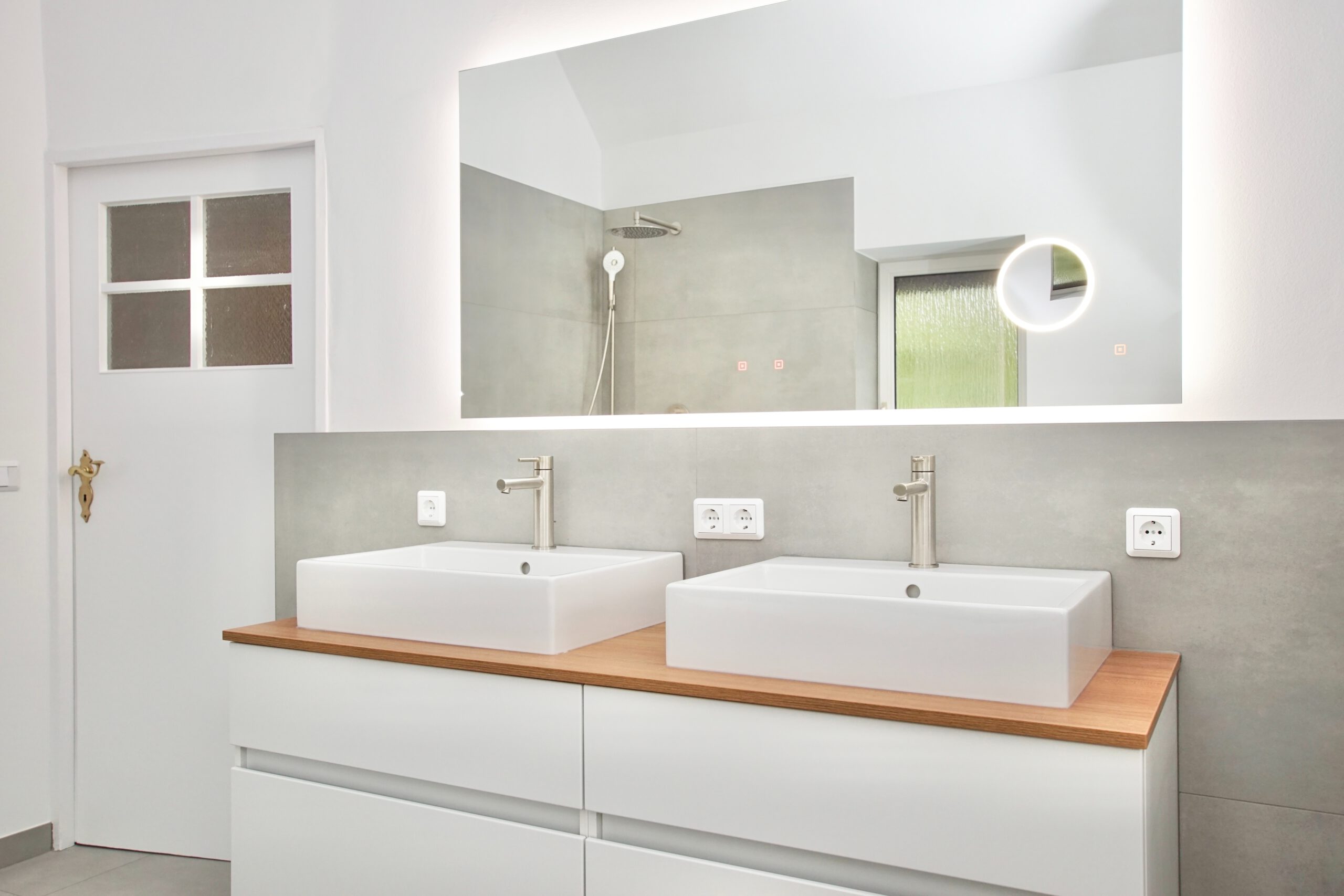 Ein besonderes Highlight ist das neu gestaltete Badezimmer mit großformatigen grauen Fliesen, freistehender Badewanne, Doppelwaschbecken mit Unterschrank und großem, beleuchtetem Spiegel, Dusche sowie separatem WC. Das zusätzliche Gäste-WC mit Tageslicht ist stilvoll mit gemusterter Tapete und eleganten Sanitärobjekten gestaltet. Ein separater kleiner Hauswirtschaftsraum mit Anschluss für Waschmaschine und Trockner rundet das exklusive Wohnangebot ab.