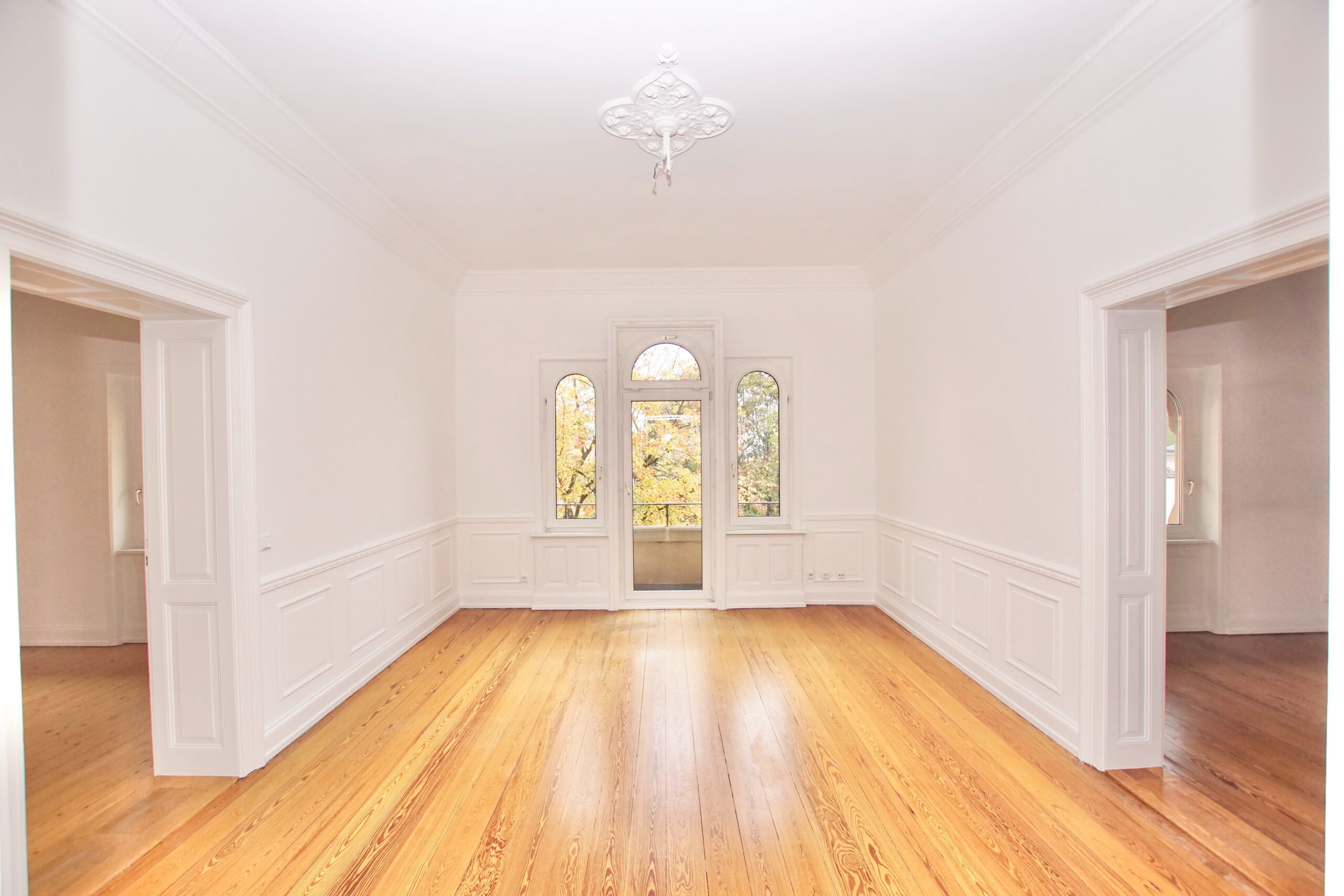 Über das herrschaftliche Treppenhaus gelangen Sie in das oberste Geschoss der vollständig sanierten Altbauvilla. Schon beim Betreten empfängt Sie ein elegantes Ambiente mit hochwertig aufgearbeiteten Holzdielen, frisch weiß gestrichenen Wänden mit Malervlies, wunderschönen Holztüren und stilvollen Wandvertäfelungen. Dank der zahlreichen Fenster ist die Wohnung außergewöhnlich hell und lichtdurchflutet.