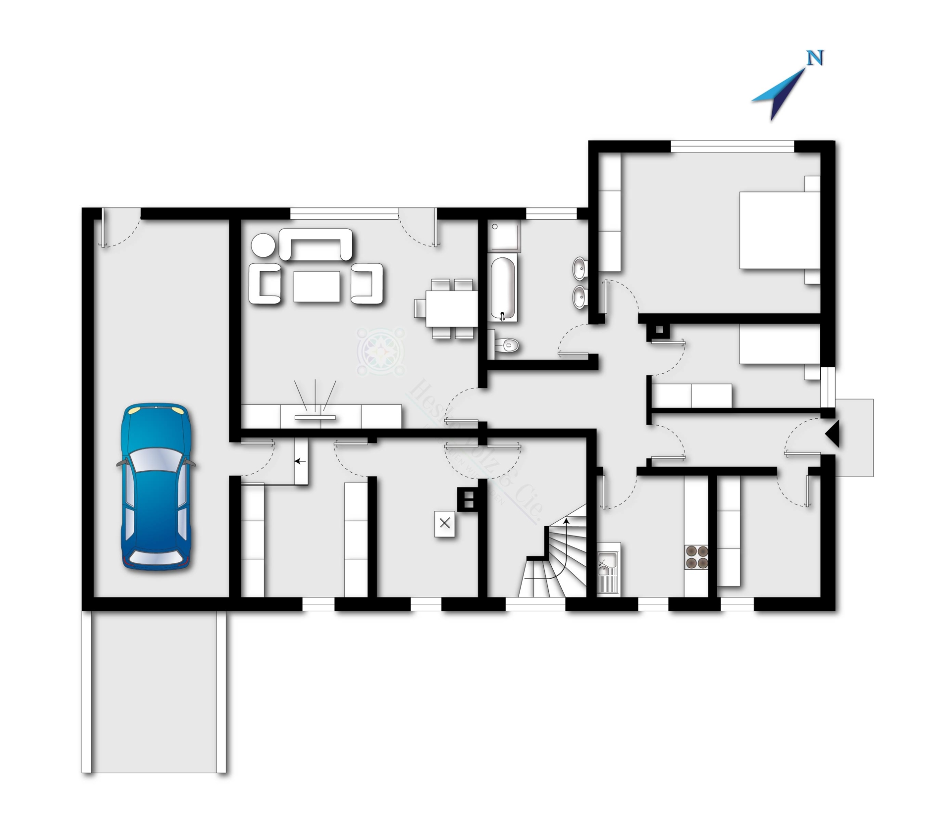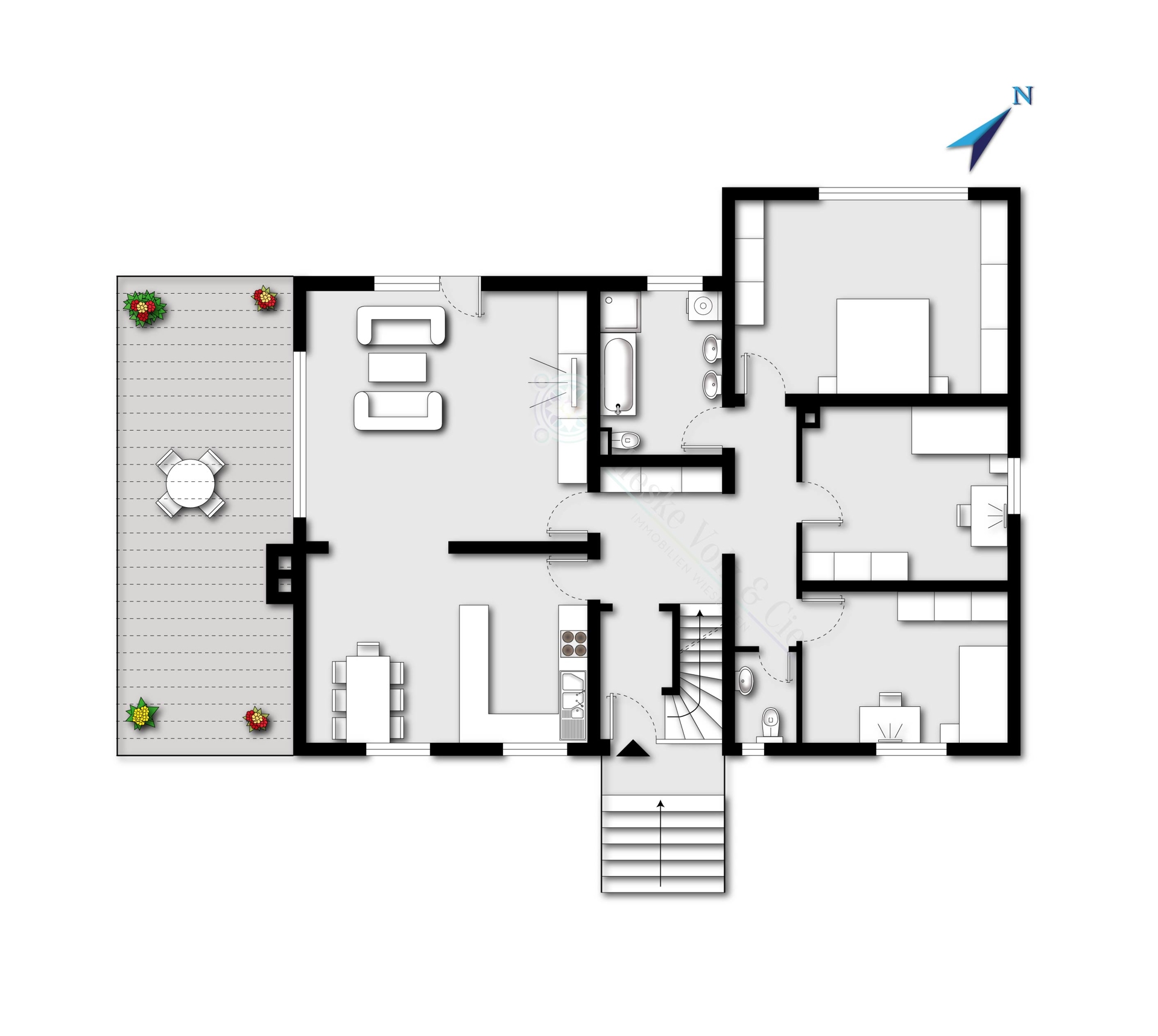 Das Untergeschoss umfasst drei Zimmer, eine Küche, ein Badezimmer und einen Abstellraum. Durch den praktischen Schnitt und den eigenen, fast stufenlosen Zugang eignet sich diese Etage ideal für eine Einliegerwohnung oder zur separaten Nutzung. Auch hier befindet sich eine Terrasse mit Zugang zum Garten.