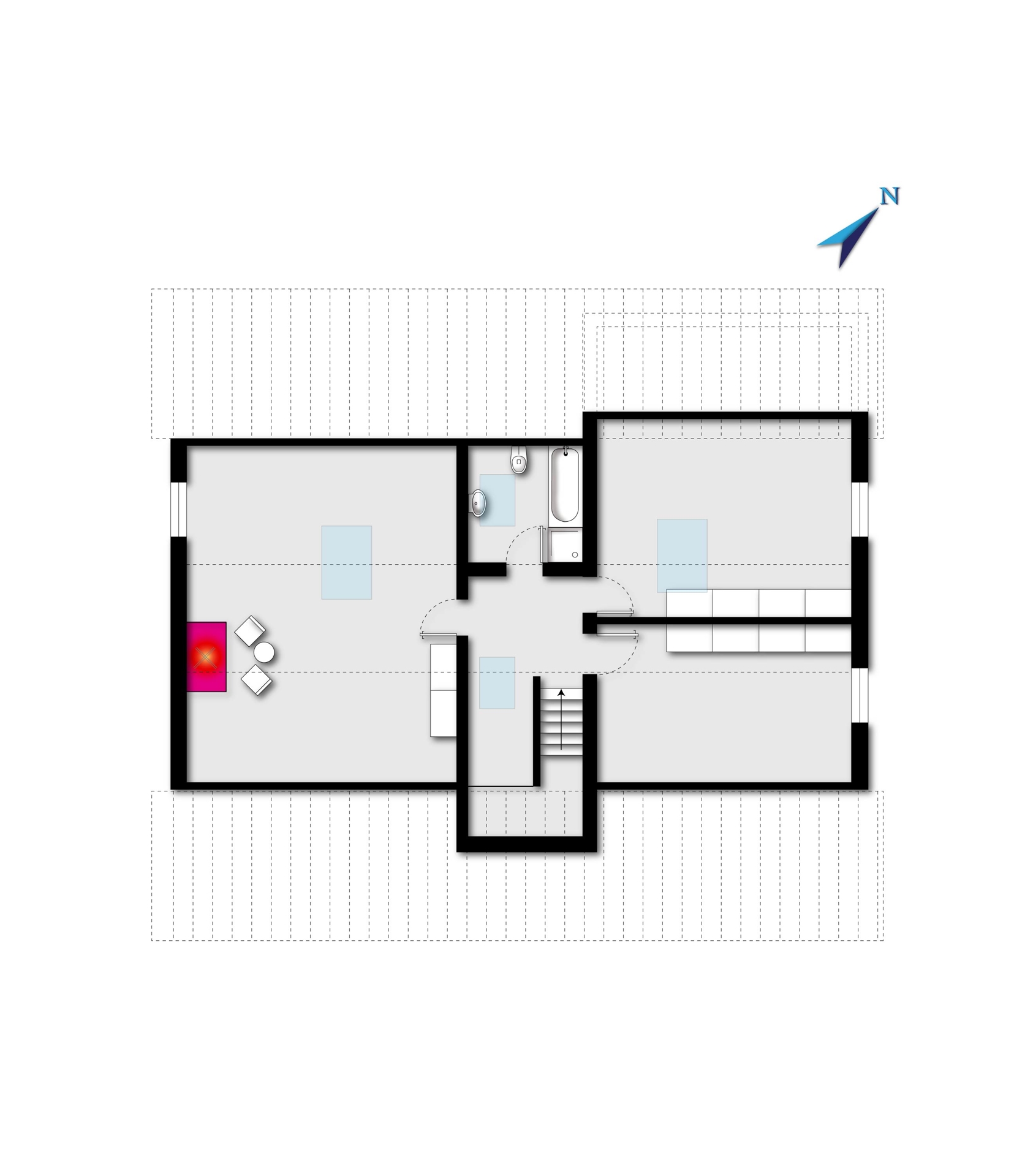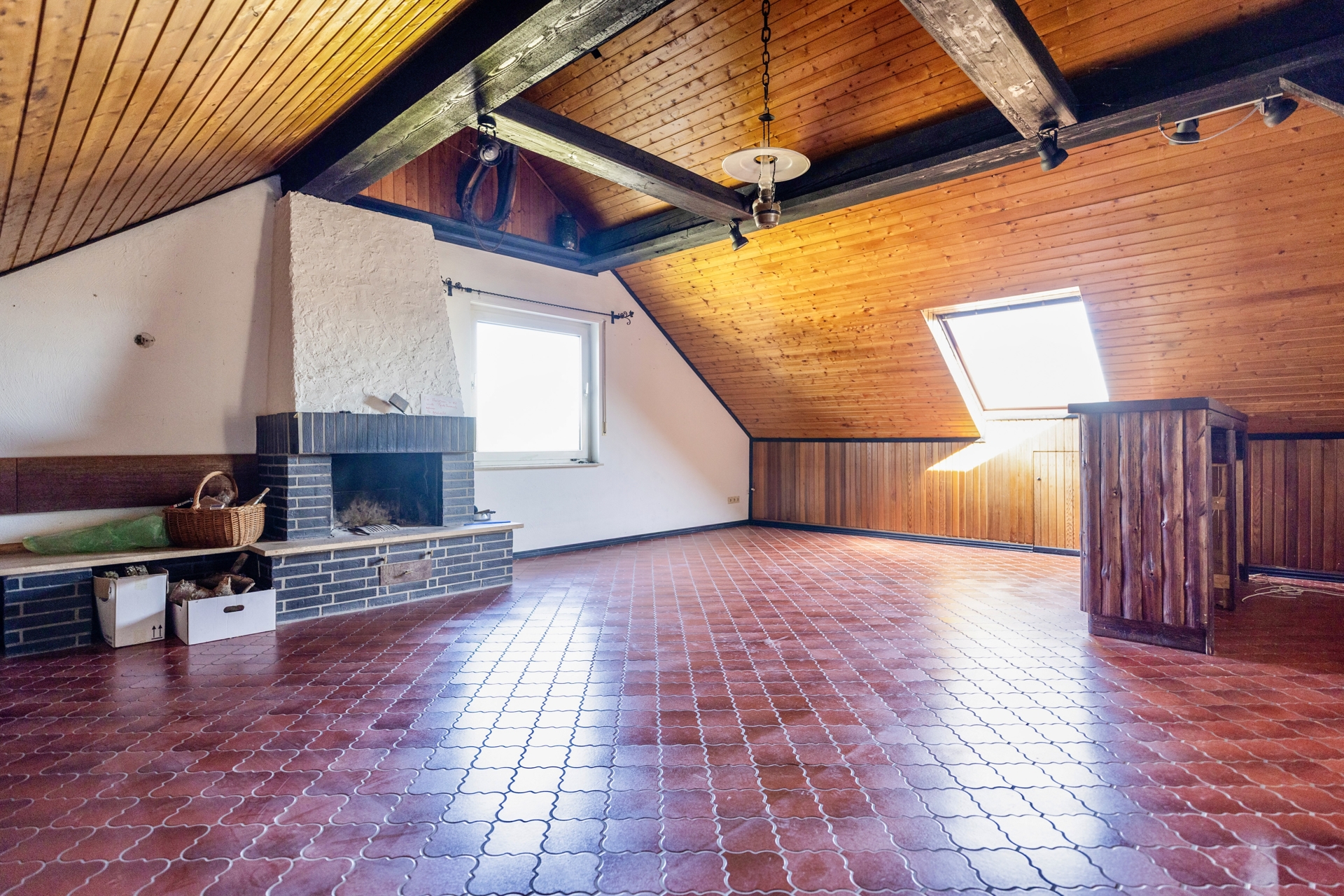 Das Dachgeschoss wurde wohnlich ausgebaut und umfasst drei Zimmer sowie ein Badezimmer. Zwei der Zimmer bieten sich ideal als Home-Office, Hobbyraum oder Jugendzimmer an. Ein weiteres Zimmer mit offenem Dachstuhl verfügt über einen Kamin und schafft eine besonders gemütliche Atmosphäre.