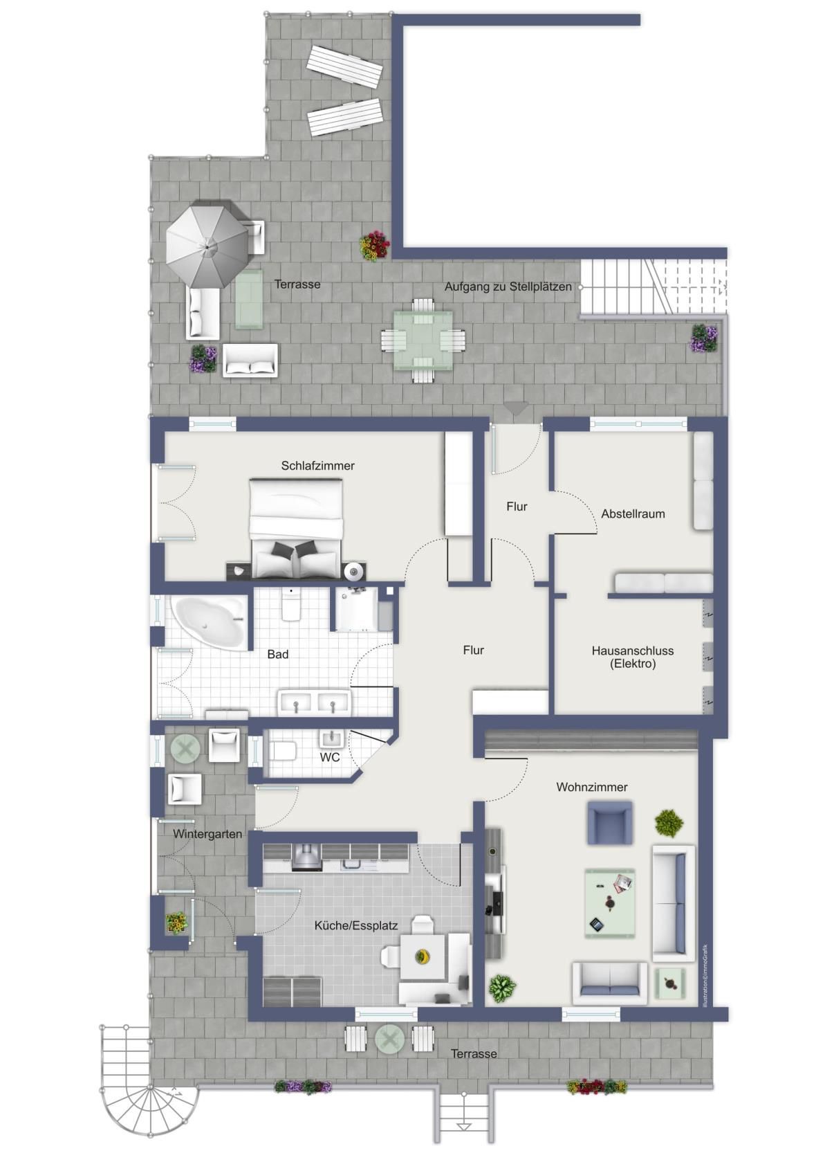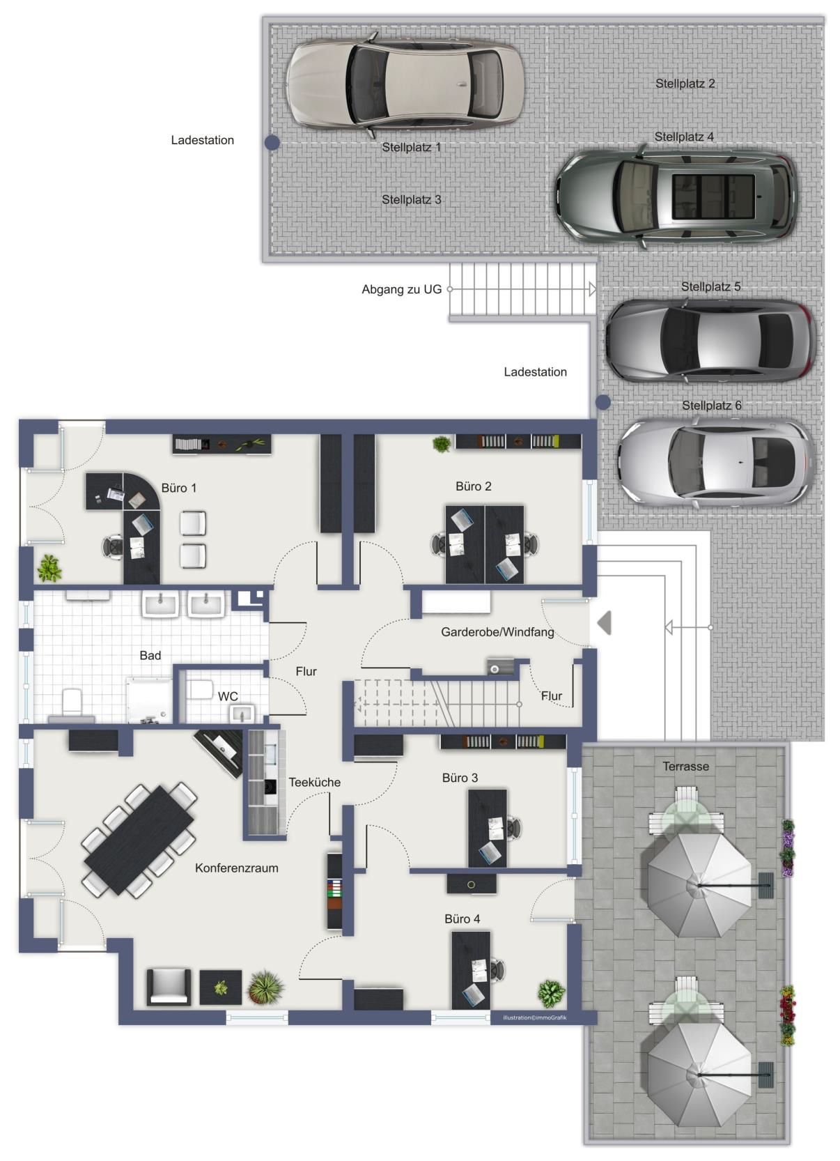 Wer andere Raumkonzepte bevorzugt, findet hier ideale Voraussetzungen: Das Büro im Erdgeschoss lässt sich mit überschaubarem Aufwand in weiteren Wohnraum umwandeln oder mit der Dachgeschoss-Wohnung verbinden, um besonders weitläufiges Wohnen zu ermöglichen.