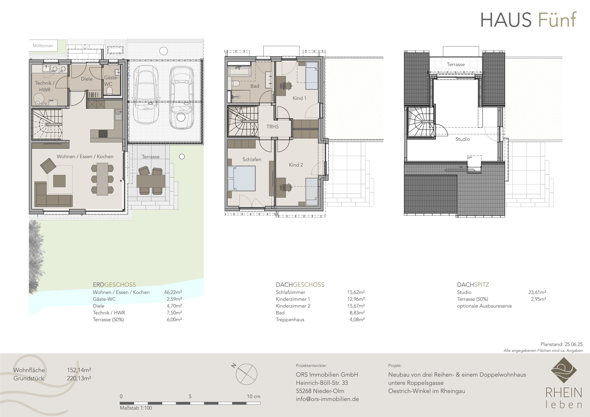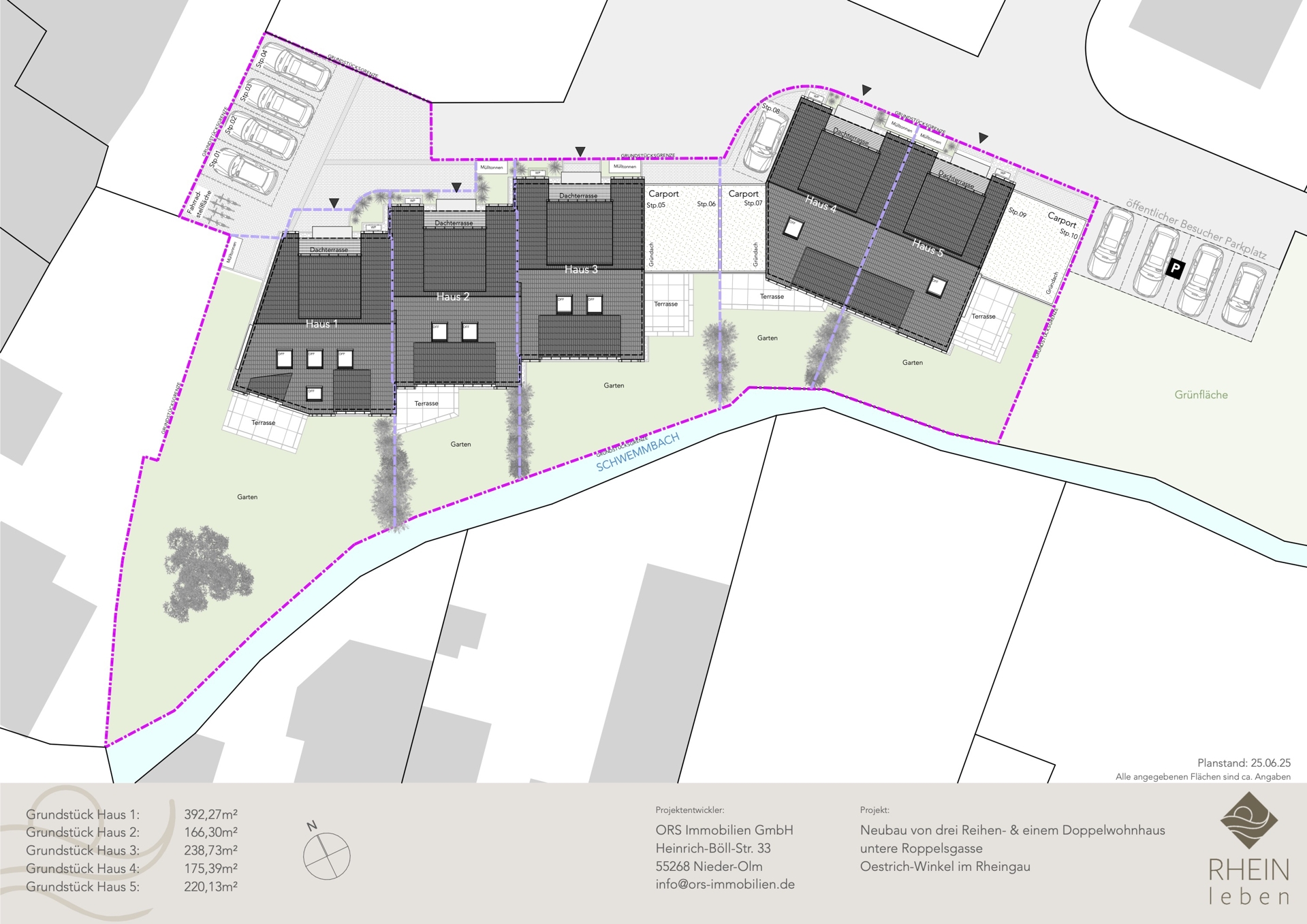 Dieses durchdachte Bauprojekt umfasst fßnf hochwertige Wohneinheiten: Drei Reihenhäuser und ein Doppelhaus, harmonisch gruppiert um einen zentral gelegenen Platz. Die Anordnung schafft eine angenehme, private Nachbarschaftsatmosphäre mit kurzen Wegen und einem stimmigen Gesamtbild.